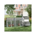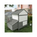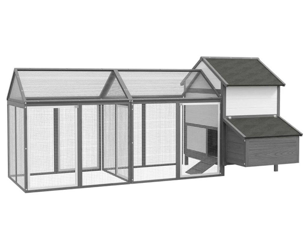 Coteț de găini din lemn pentru 2-3 găini, realizat din lemn de brad, cu două rampe, acoperiș asfaltic, cuib exterior pentru ouat, ușă din lemn și sârmă, tavă retractabilă pentru bălegar, dimensiuni 247x125x113,5 cm.