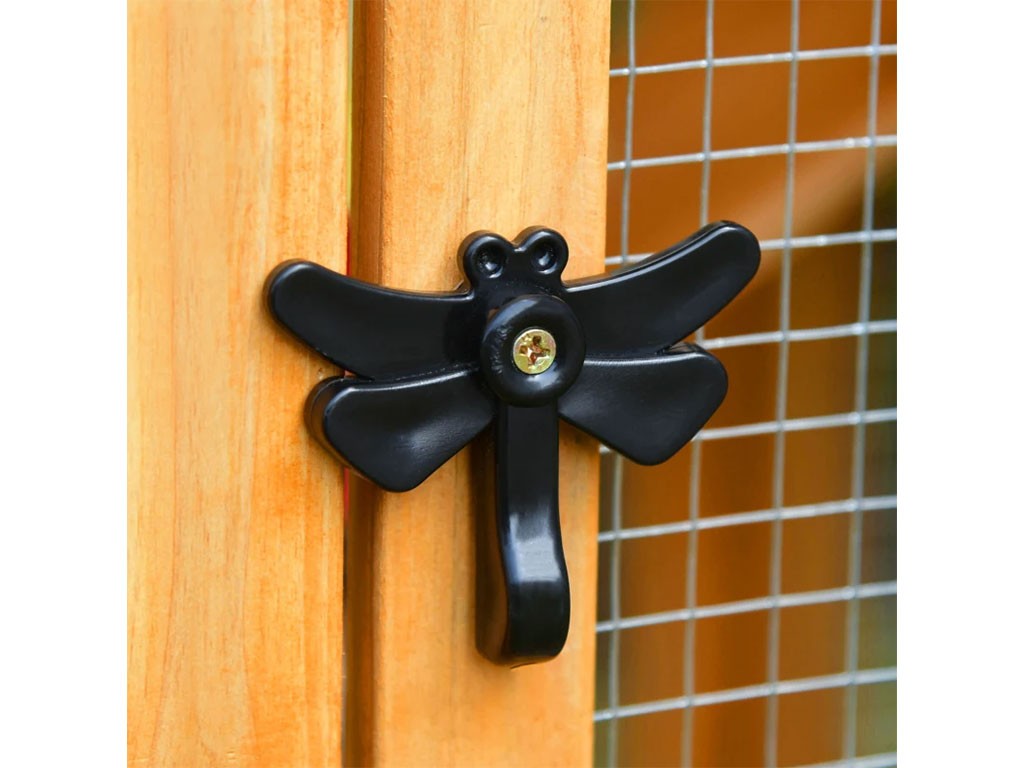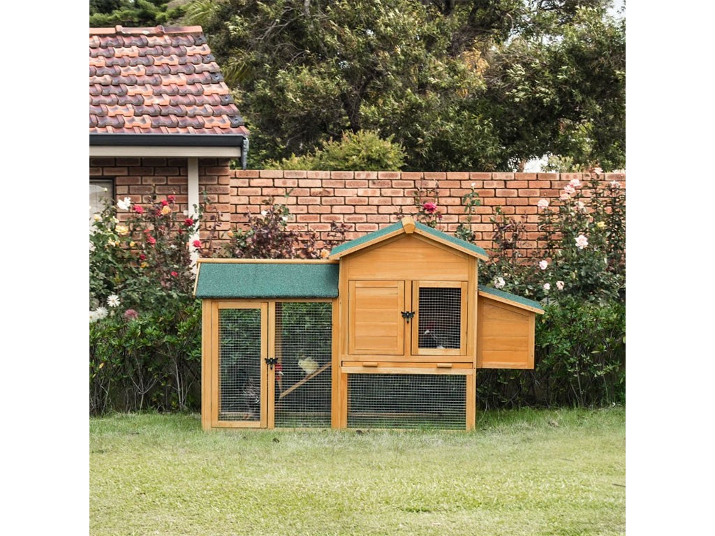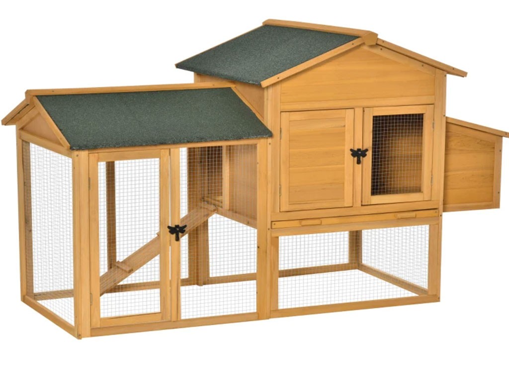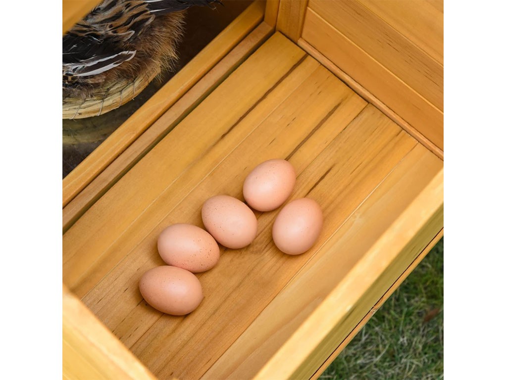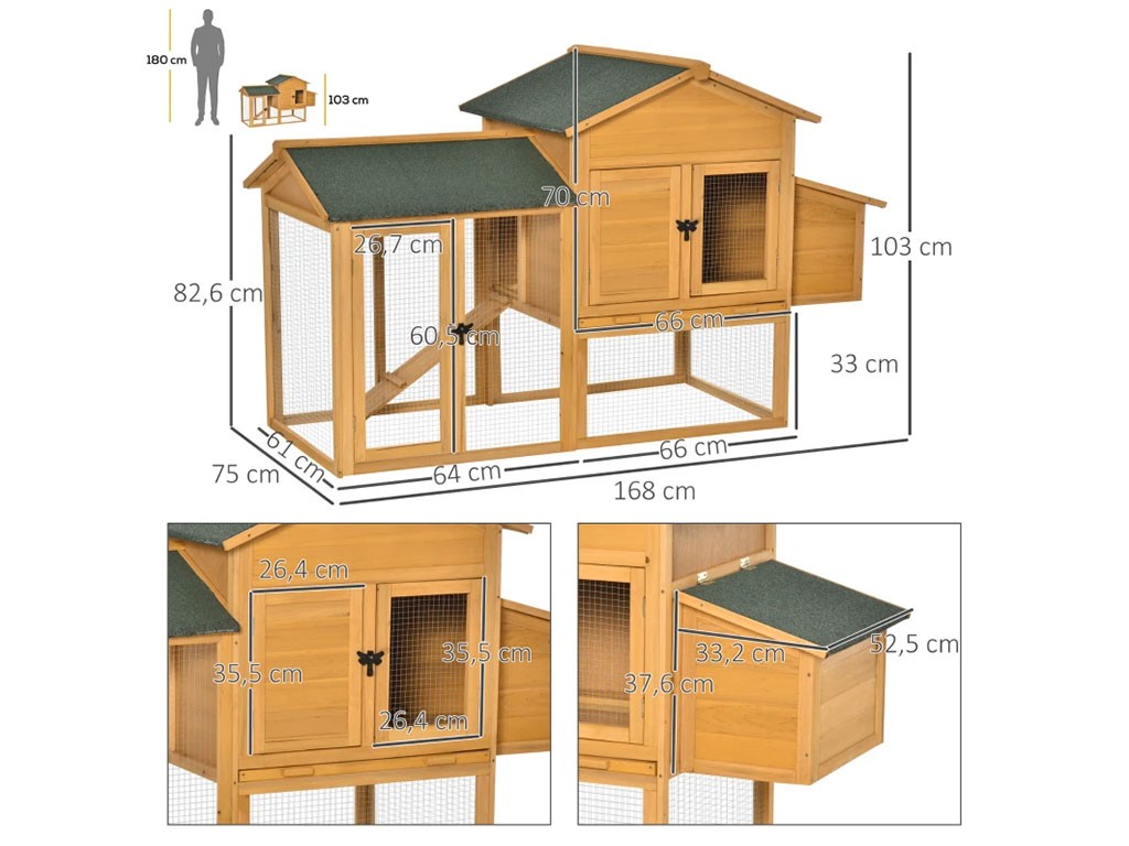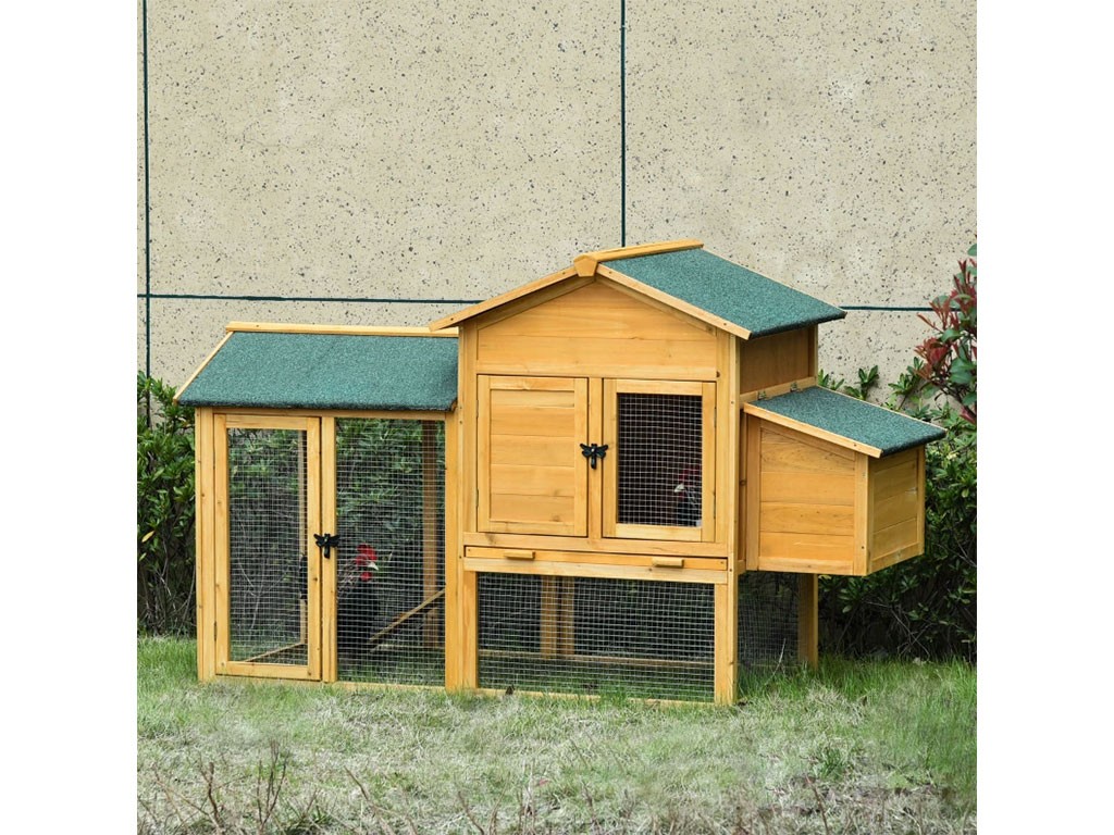 Coteț de găini din lemn pentru 2-4 găini , realizat din lemn de brad , ușă cu încuietoare , acoperiș cu balamale , 1 cuib exterior pentru ouat , ușă din lemn și sârmă , tavă retractabilă pentru bălegar , dimensiuni 168x103x75 cm.