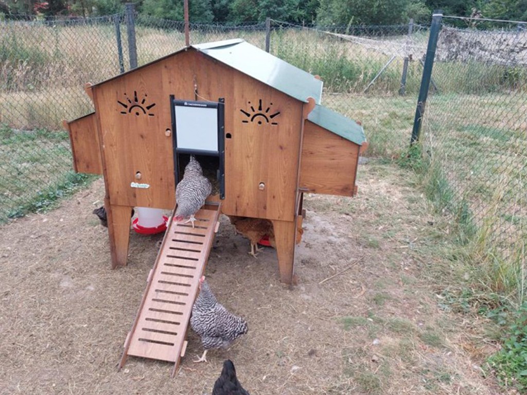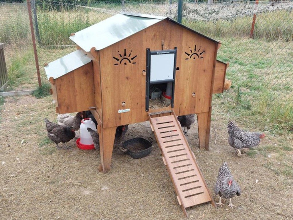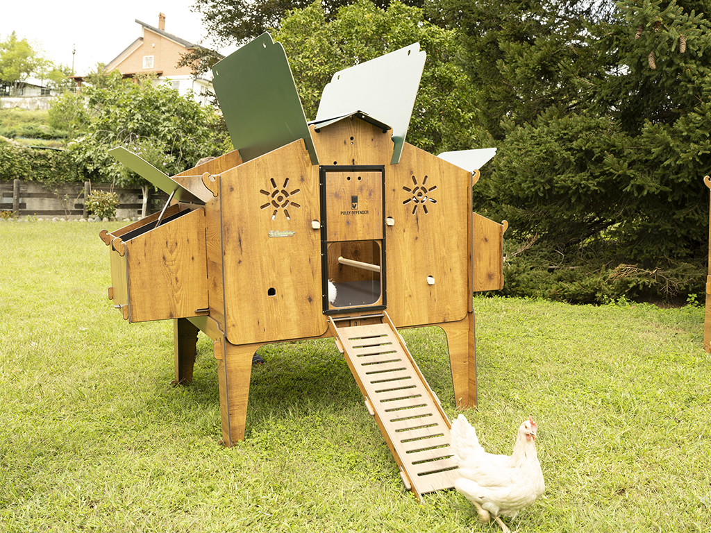 Cotețul pentru găini este dotat cu patru stinghii pentru ca găinile să se odihnească noaptea. Cotețul include și patru adăposturi exterioare , în care găinile vor avea suficient spațiu și liniște pentru a depune ouă. Luarea ouălor va fi foarte ușoară , deoarece pentru a le ridica , trebuie doar să ridicați acoperișul cuiburilor de ouat. Datorită faptului că cotețul este ridicat pe picioare la 50 cm de sol , oferă găinilor protecție împotriva soarelui sau a ploii chiar și în timpul zilei. Acest spațiu de sub coteț este ideal pentru amplasarea adăpătorilor și hrănitorilor. Găinile au acces convenabil la coteț în timpul zilei prin intermediul unei scări. Pachetul include o ușă de siguranță Polly Defender , la care puteți conecta cu ușurință un sistem de deschidere automată a cotețului, dacă sunteți interesat. Deschiderea și închiderea automată a cotețului nu este inclusă în pachet!