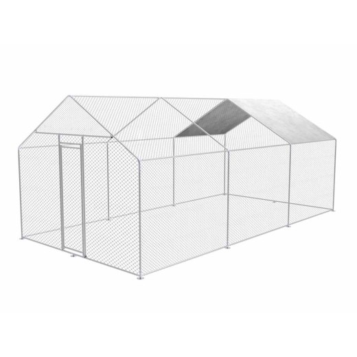 Gard galvanizat pentru păsări , sistem modular de conectare, plasă galvanizată acoperită cu PVC, dimensiunea plasei gardului 45x25mm, poartă de intrare mare, țevi galvanizate ∅25x0.65mm, prelată de protecție împotriva luminii solare directe, dimensiuni 300x600x245cm.