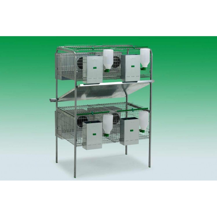 Țarc pentru iepuri Lima - un țarc cu două etaje și 4 țarcuri. 2 țarcuri sunt pentru masculi, 2 țarcuri sunt pentru femele, inclusiv 4 bârlocuri de plastic, hrănitoare cu două locuri, jgheaburi pentru fân și adăpătoare cu sticle.