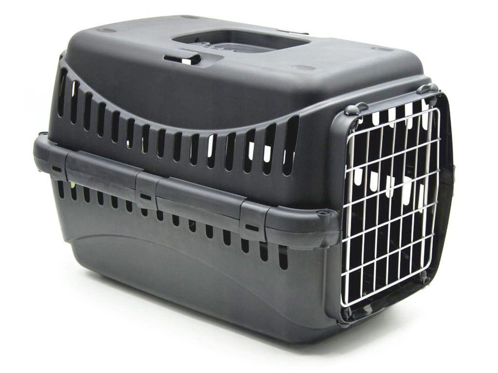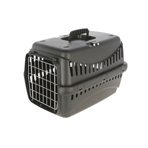Pentru câini și pisici de până la 6 kg, capacul și cuva sunt conectate prin cleme, ușă frontală metalică, mâner pentru transportul ușor al cuștii, două suporturi pentru centura de siguranță auto, dimensiuni 45x30x30cm.