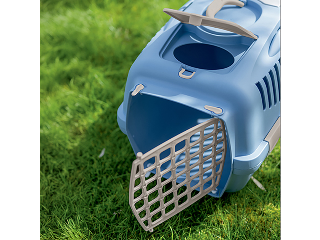 Pentru câini și pisici de până la 6 kg, capacul și cuva sunt conectate prin cleme, ușă frontală cu 4 încuietori, deschidere reglabilă a ușii la dreapta sau la stânga , mâner pentru transportul ușor al cuștii, două suporturi pentru centura de siguranță auto , dimensiuni interne 45x29x26,5 cm, dimensiuni externe 48x32x31 cm.