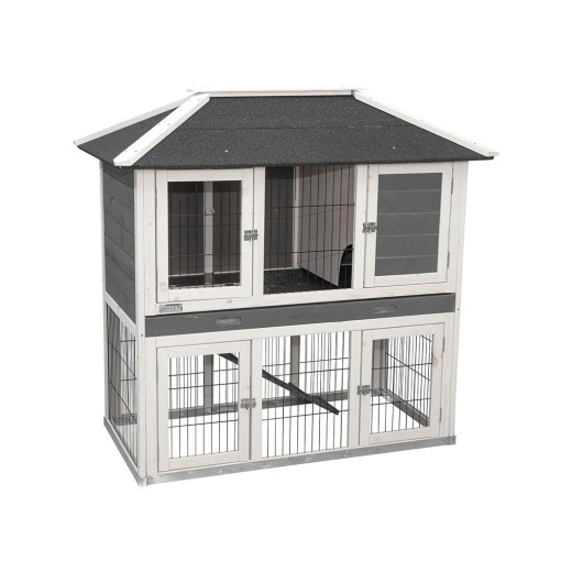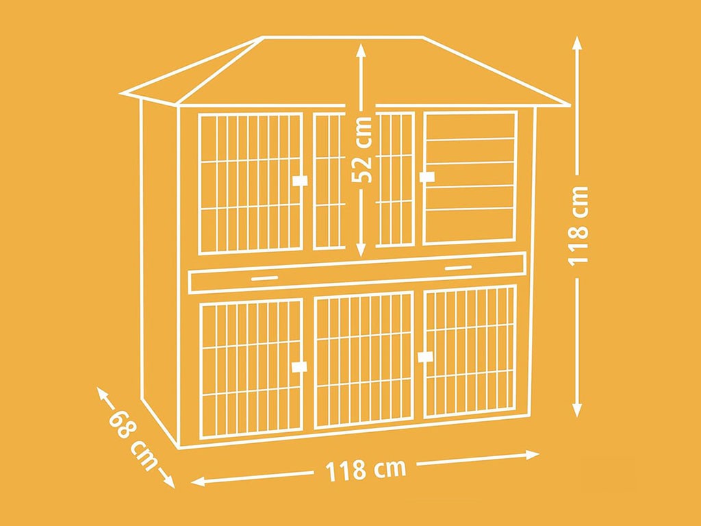 Cușcă din lemn pentru iepuri, cobai, chinchilla și alte rozătoare cu dimensiunile de 118x68x118 cm. Aceasta este o cușcă practică pentru iepuri cu țarc , echipată cu o tavă detașabilă pentru bălegar. pentru curățare ușoară. Patru uși frontale de pe cușca și țarcul pentru iepuri asigură acces fără probleme.