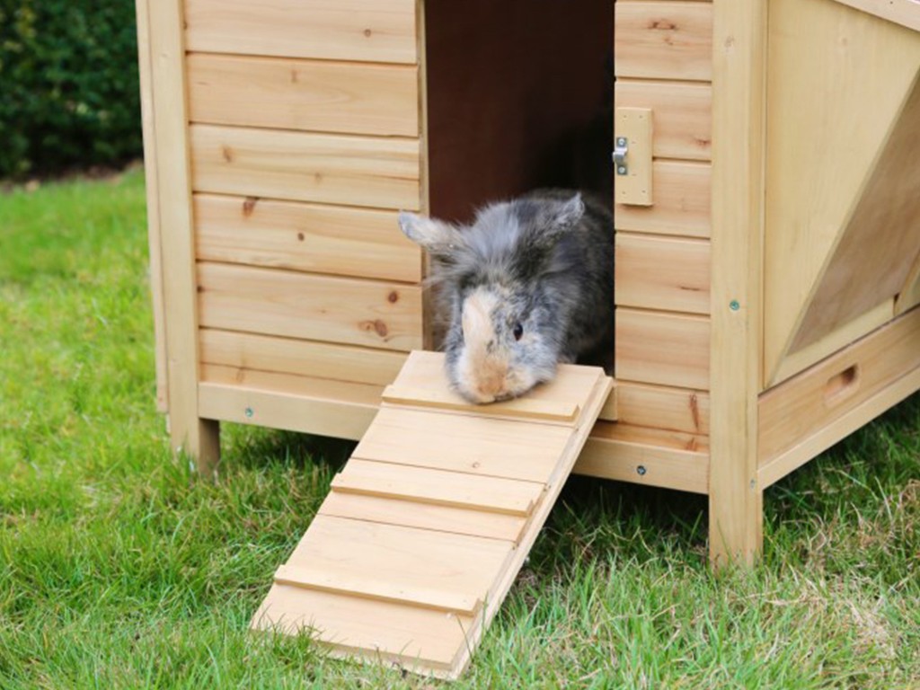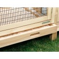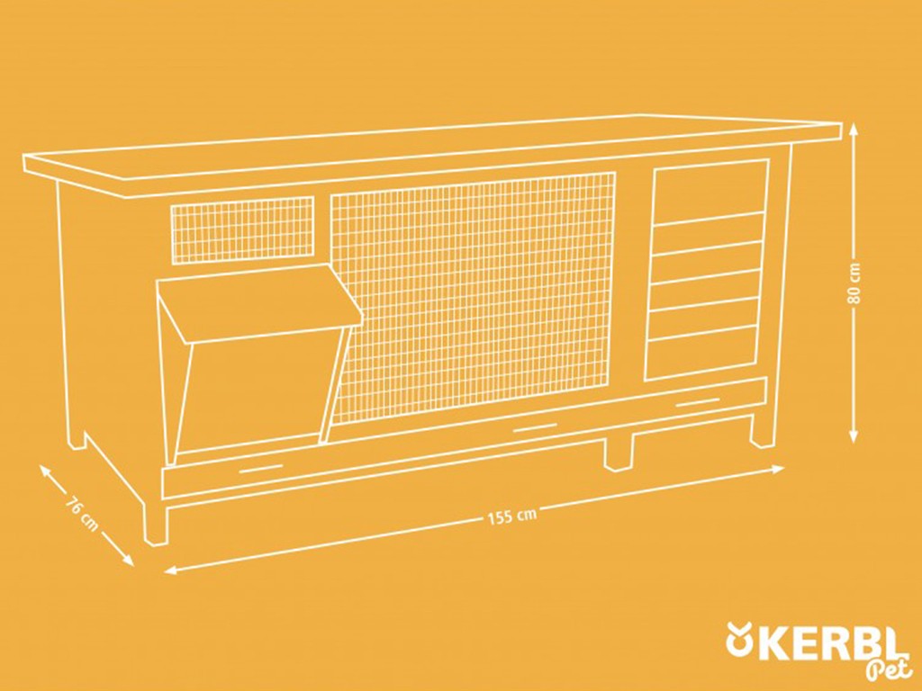 Cușcă din lemn pentru iepuri sau alte rozătoare mici cu dimensiunile de 155x76x80 cm. Aceasta este o cușcă de iepuri de lux, echipată cu o tavă detașabilă pentru bălegar . pentru curățare ușoară, un suport pentru fân și spațiu pentru depozitarea hranei pentru iepuri și a accesoriilor. Două uși frontale și una laterală, precum și un acoperiș rabatabil, asigură accesul facil la cușca pentru iepuri .