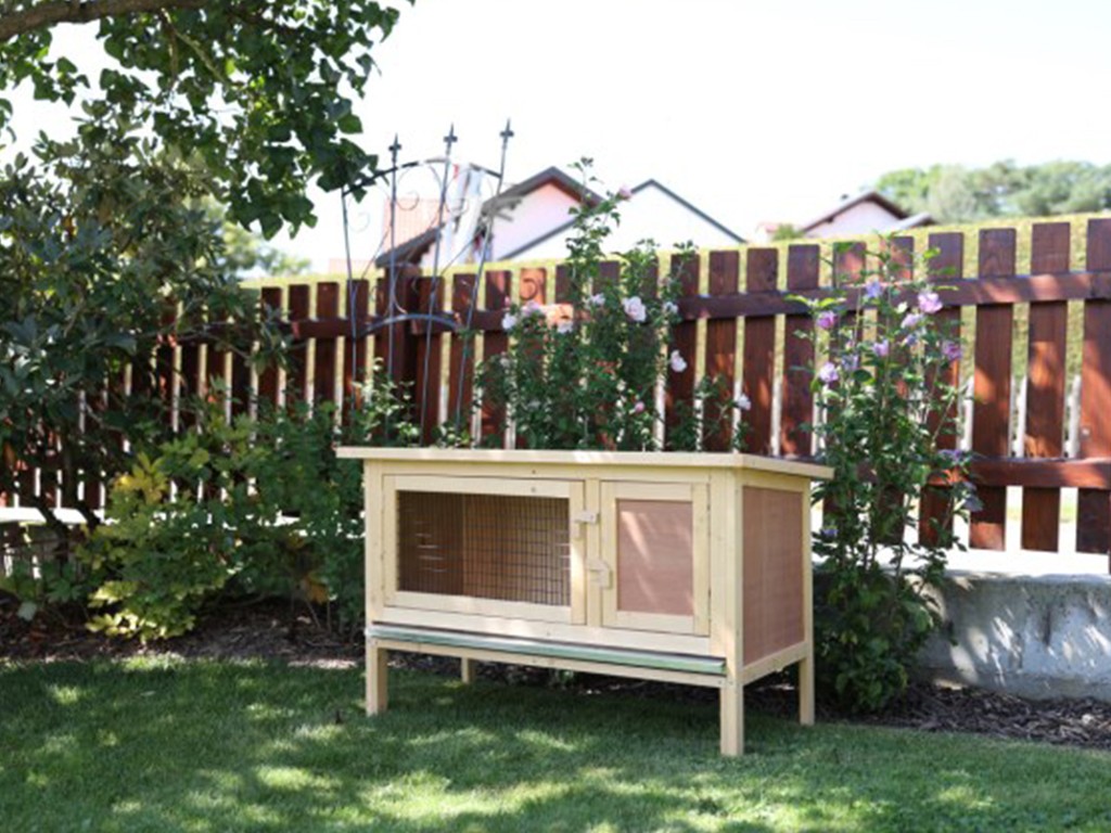 Cușca pentru iepuri din lemn cântărește aproximativ 14 kg. Acoperișul cuștii este acoperit cu un material impermeabil protector. Cu toate acestea, recomandăm amplasarea cuștii sub un adăpost pentru a o proteja de ploaie, zăpadă și lumina directă a soarelui. Iarna, recomandăm mutarea cuștii într-o zonă mai caldă. Cușca din lemn este tratată la suprafață cu un strat protector de bază. Pentru o durată de viață mai lungă, stratul protector trebuie reînnoit, ca în cazul oricărui material din lemn.