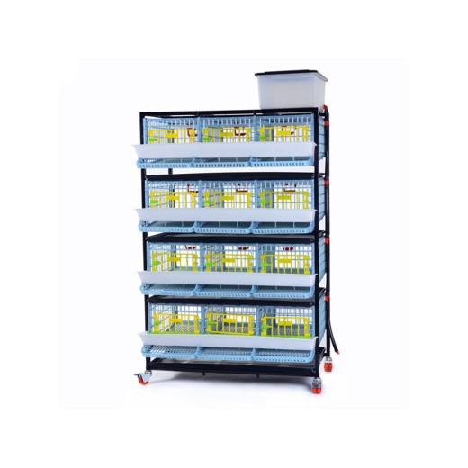 Cușcă pentru prepelițe potrivită pentru reproducerea a 72 până la 120 de prepelițe, cu tehnologie patentată Comfortplast , dimensiuni 98 x 62 x 164 cm . Este o cușcă cu 4 niveluri și 12 compartimente , care sunt echipate cu o tavă proprie pentru ouăle de prepeliță, un hrănitor cu grătar pentru a preveni risipa de hrană, o adăpătoare cu alimentare cu apă dintr-un acvariu de 20 de litri . Cuștile sunt fabricate din plastic cu rezistență ridicată la excrementele de prepeliță și bacterii - întreținere foarte ușoară a cuștii și a excrementelor. Posibilitate de extindere cu încă un nivel (max. 5 niveluri), manipulare ușoară folosind roți cu frâne.