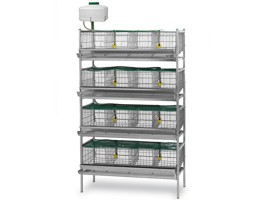 Pe cușca pentru prepelițe GAUN 0440 cu două niveluri se pot suprapune niveluri suplimentare , cu o înălțime de până la patru niveluri și o capacitate de până la 96 de prepelițe.