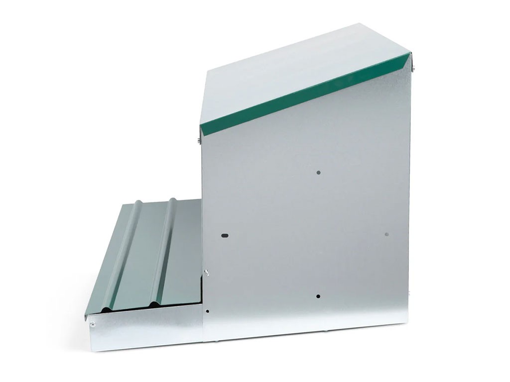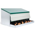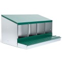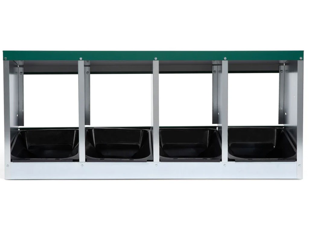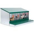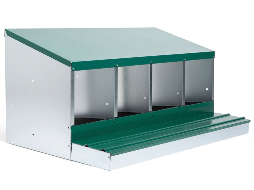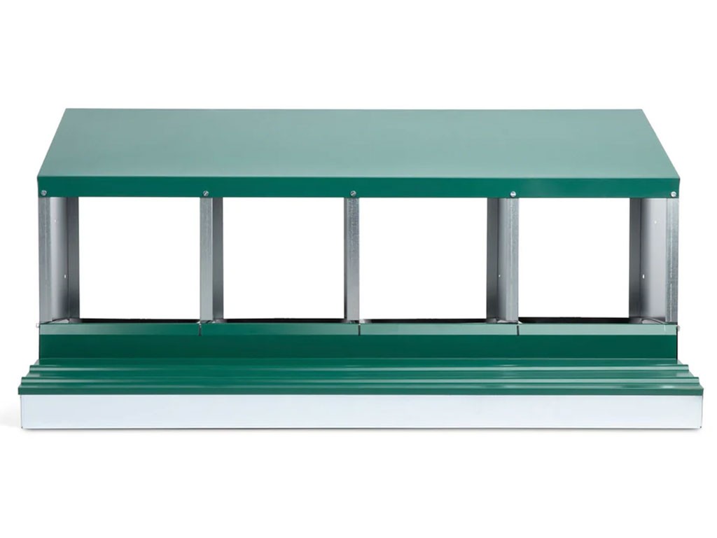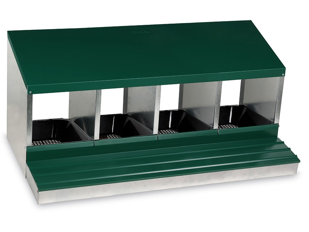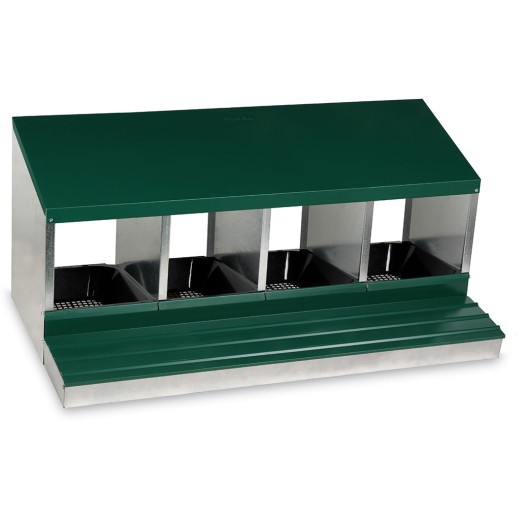 Cuib pentru găini ouătoare cu coș de colectare a ouălor, cu patru locuri , capacitate de până la 20 de găini ouătoare (5 găini ouătoare per clocitoare), partea inferioară a cuibului este înclinată, ouăle se rostogolesc singure în coșul de colectare, fabricat din metal galvanizat, culoare verde . Puteți pur și simplu să așezați cuibul pe pământ în cotețul de găini sau să îl agățați pe perete , foarte ușor de curățat , dimensiuni: 56 cm lungime x 106,3 cm lățime x 45,5 cm înălțime.