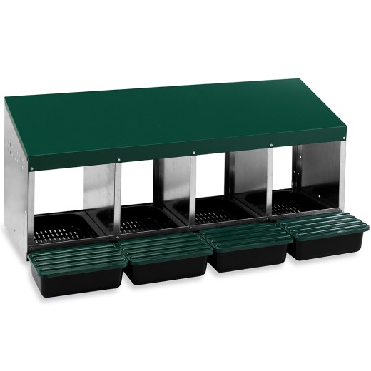 Cuib pentru găini ouătoare cu coș de colectare a ouălor, cu patru locuri , capacitate de până la 20 de găini ouătoare (5 găini ouătoare per clocitoare), partea inferioară a cuibului este înclinată, ouăle se rostogolesc singure în coșul de colectare, fabricat din metal galvanizat cu fund din plastic, culoare verde . Puteți pur și simplu să așezați cuibul pe pământ în coșul de găini sau să îl agățați pe perete , foarte ușor de curățat , dimensiuni: 48 cm lungime x 106,1 cm lățime x 52 cm înălțime.