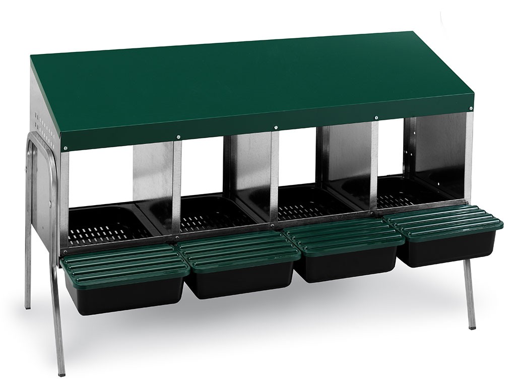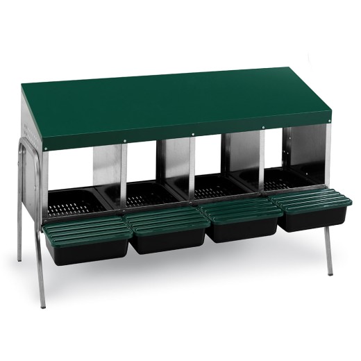 Cuib pentru găini ouătoare cu coș de colectare a ouălor, cu patru locuri pe picioare, capacitate de până la 20 de găini ouătoare (5 găini ouătoare per coteț), partea inferioară a cuibului este înclinată, ouăle se rostogolesc singure în coșul de colectare, fabricat din metal galvanizat cu fund din plastic, culoare verde . Puteți așeza pur și simplu cuibul pe pământ în cotețul de găini , foarte ușor de curățat , dimensiuni: 110,1 cm lungime x 52 cm lățime x 66,5 cm înălțime.