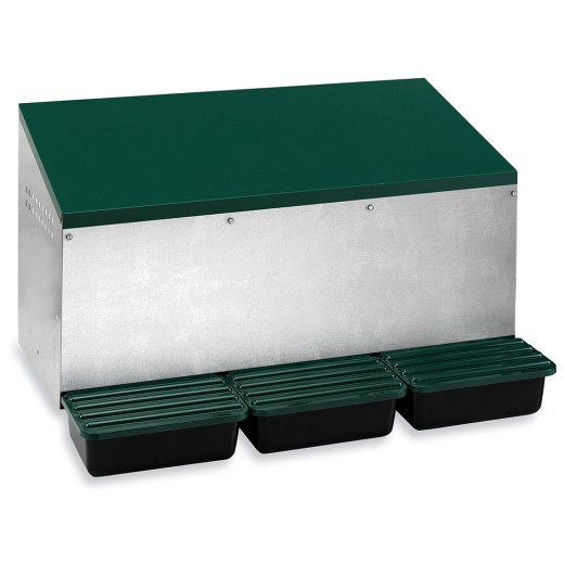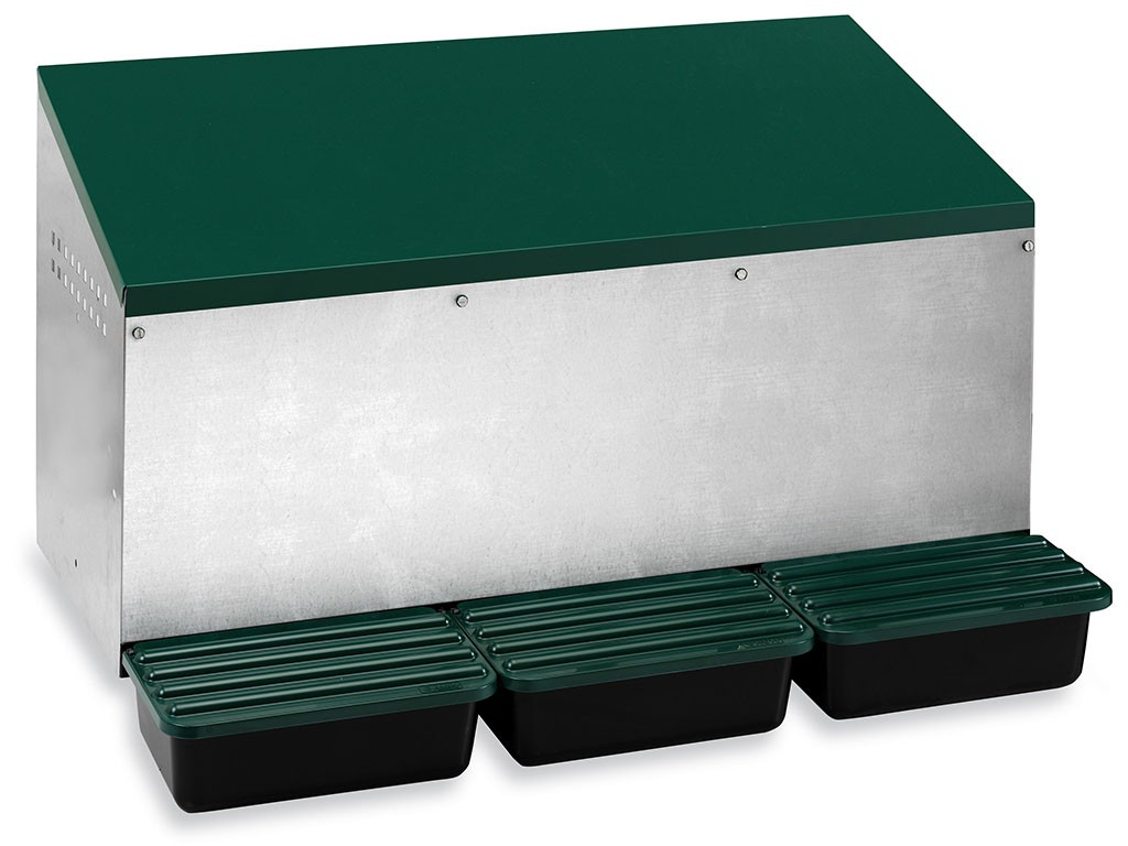 Cuib de ouat pentru exterior , pentru găini , cu coș de colectare a ouălor, cu trei locuri , pentru până la 15 găini ouătoare (5 găini ouătoare per clocitoare), partea inferioară a cuibului este înclinată, ouăle se rostogolesc singure în coșul de colectare, fabricat din metal galvanizat cu fund din plastic, culoare verde . Se atașează simplu din exteriorul cotețului de găini , foarte ușor de întreținut , dimensiuni: 48 cm lungime x 79,7 cm lățime x 52 cm înălțime.