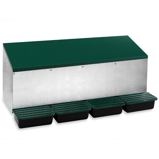 Cuib de ouat pentru exterior, pentru găini , cu coș de colectare a ouălor , cu patru locuri, pentru până la 20 de găini ouătoare (5 găini ouătoare per clocitoare), partea inferioară a cuibului este înclinată, ouăle se rostogolesc singure în coșul de colectare, realizat din metal galvanizat cu fund din plastic, culoare verde. Ușor de atașat din exteriorul cotețului de găini, foarte ușor de curățat, dimensiuni: 48 cm lungime x 106,1 cm lățime x 52 cm înălțime.