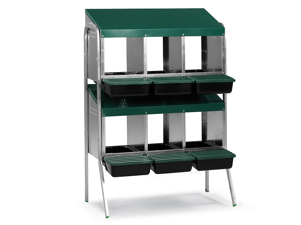 Cuib pentru găini ouătoare cu coș de colectare a ouălor, 6 locuri pe picioare, capacitate până la 30 de găini ouătoare (5 găini ouătoare per coteț), partea inferioară a cuibului este înclinată, ouăle se rostogolesc singure în coșul de colectare, fabricat din metal galvanizat cu fund din plastic, culoare verde . Puteți așeza pur și simplu cuibul pe pământ în cotețul de găini , foarte ușor de întreținut , dimensiuni: 52,2 cm lungime x 82,7 cm lățime x 121 cm înălțime.