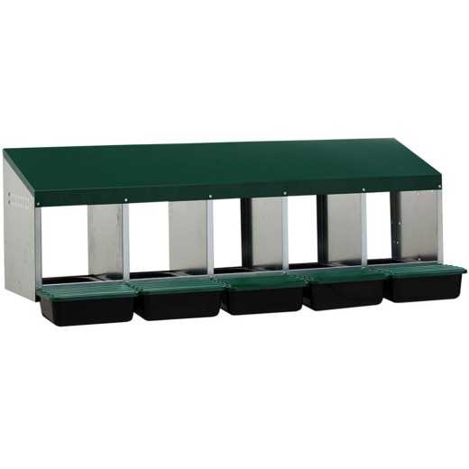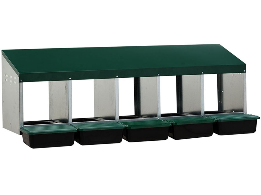 Cuib pentru găini ouătoare cu coș de colectare a ouălor, cinci locuri , capacitate de până la 25 de găini ouătoare (5 găini ouătoare per coteț), partea inferioară a cuibului este înclinată, ouăle se rostogolesc singure în coșul de colectare, fabricat din metal galvanizat cu fund din plastic, culoare verde . Puteți pur și simplu să așezați cuibul pe pământ în cotețul de găini sau să îl agățați pe perete , foarte ușor de curățat , dimensiuni: 132,5 cm lungime x 49,5 cm lățime x 49 cm înălțime.