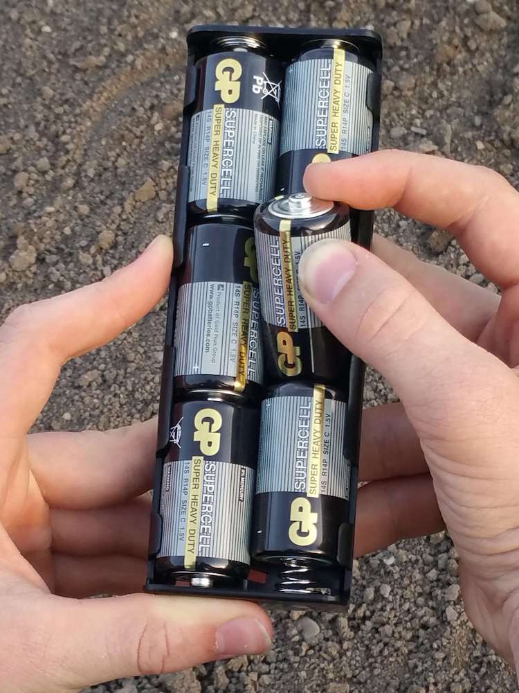 Apuci suportul pentru baterii și introduci aceste 6 baterii în el. Ai grijă la polaritate!