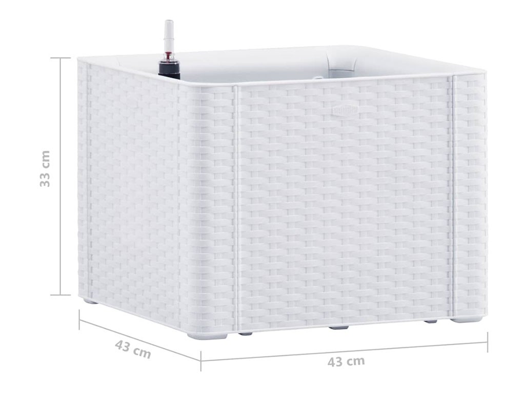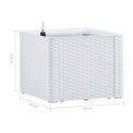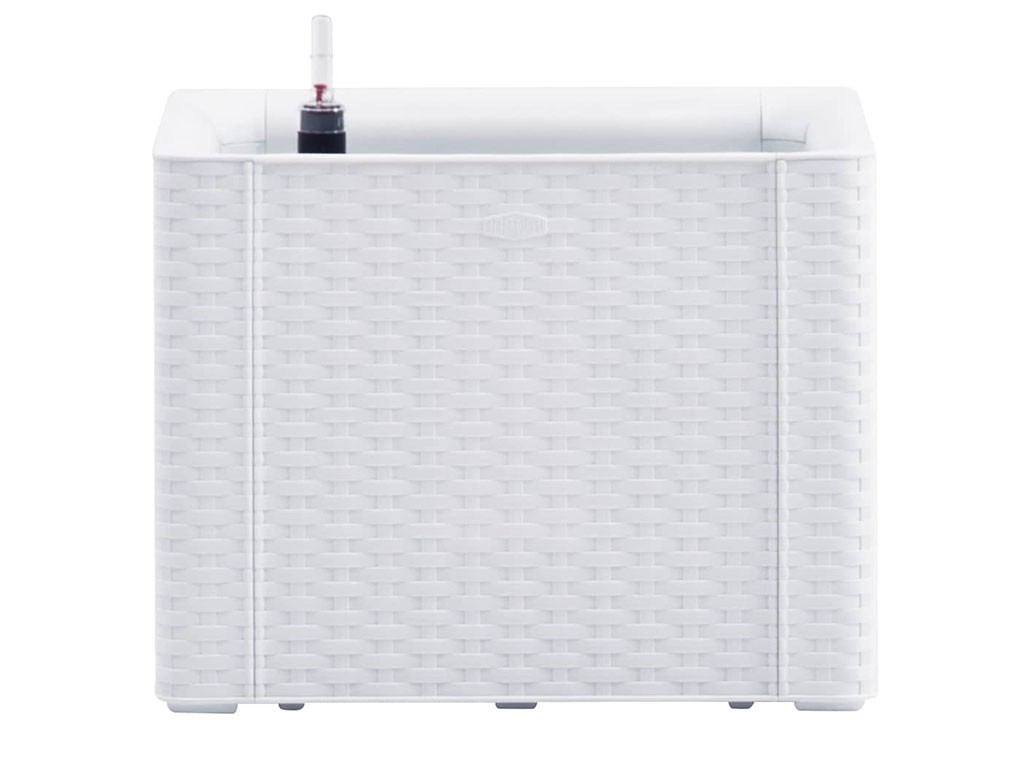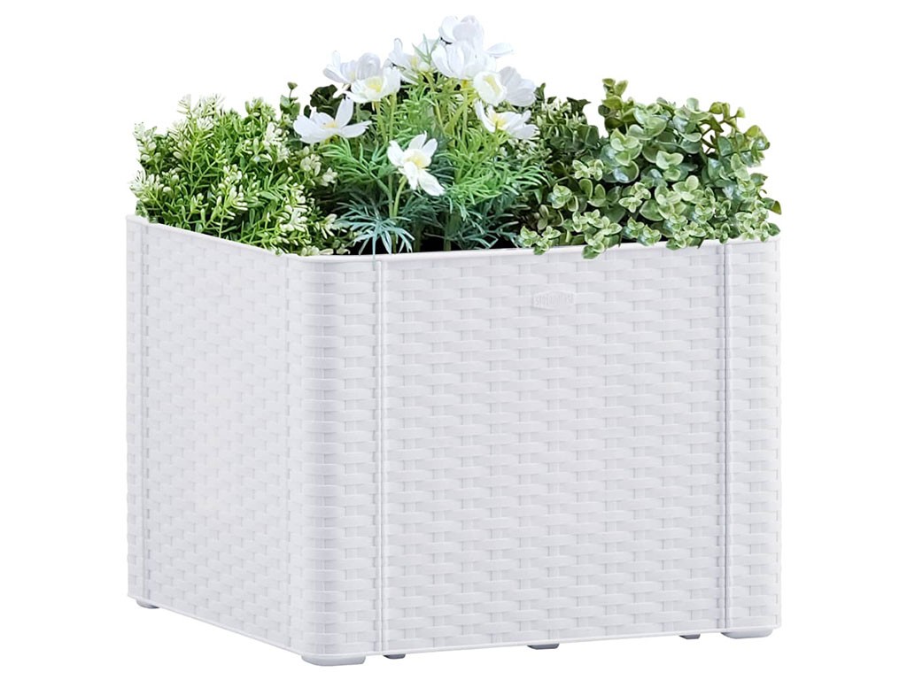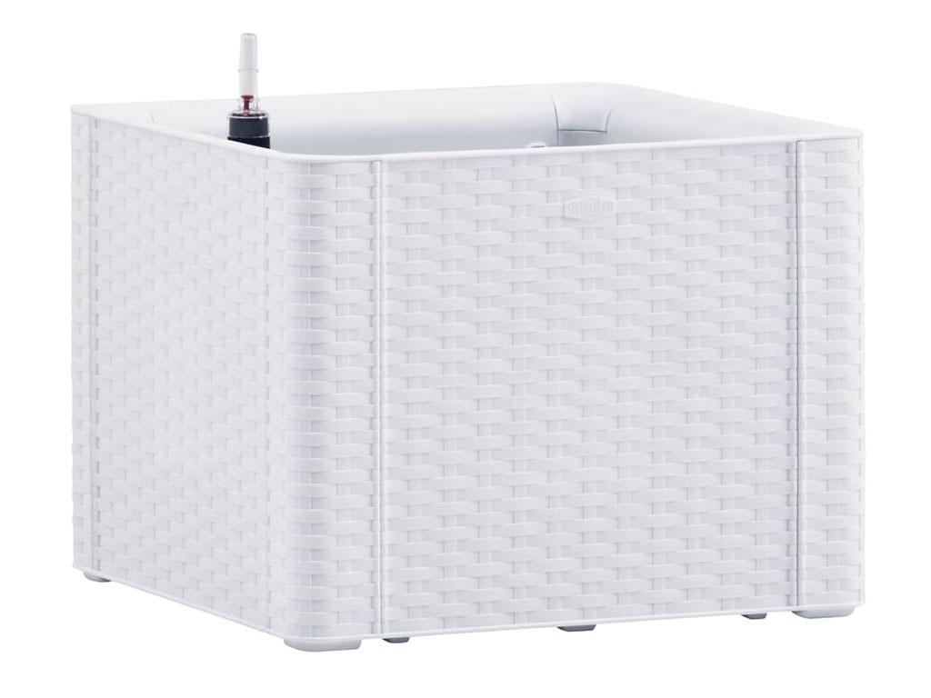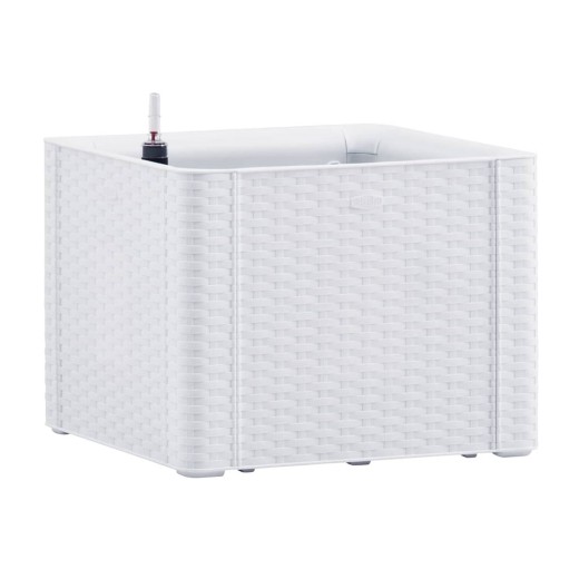 Cutie cu auto-udare , pentru interior și exterior , cu indicator al nivelului apei, fabricată din polipropilenă, culoare albă, capacitate 35l, dimensiuni 43x43x33cm.