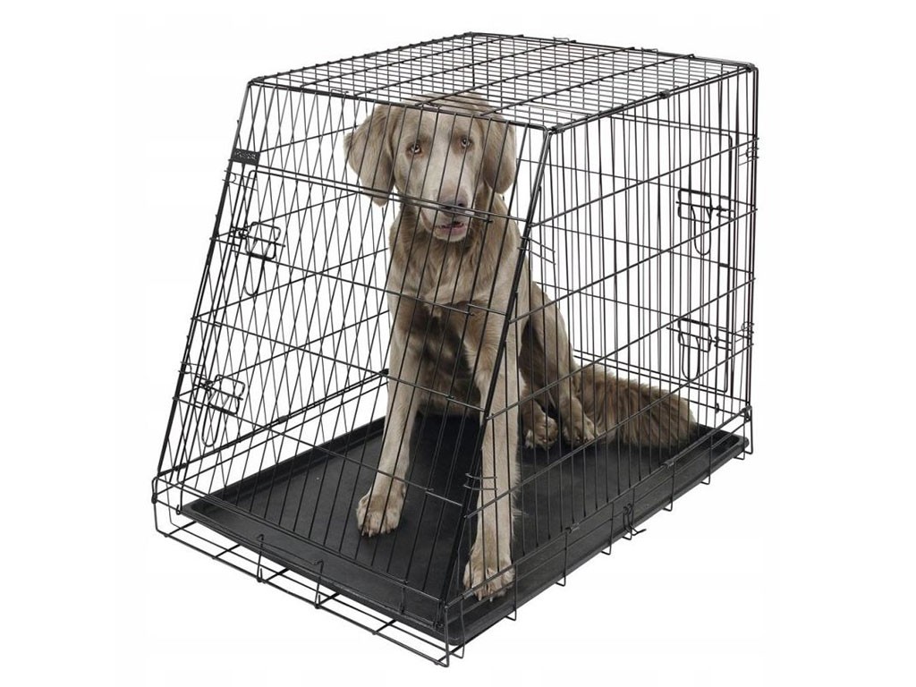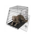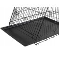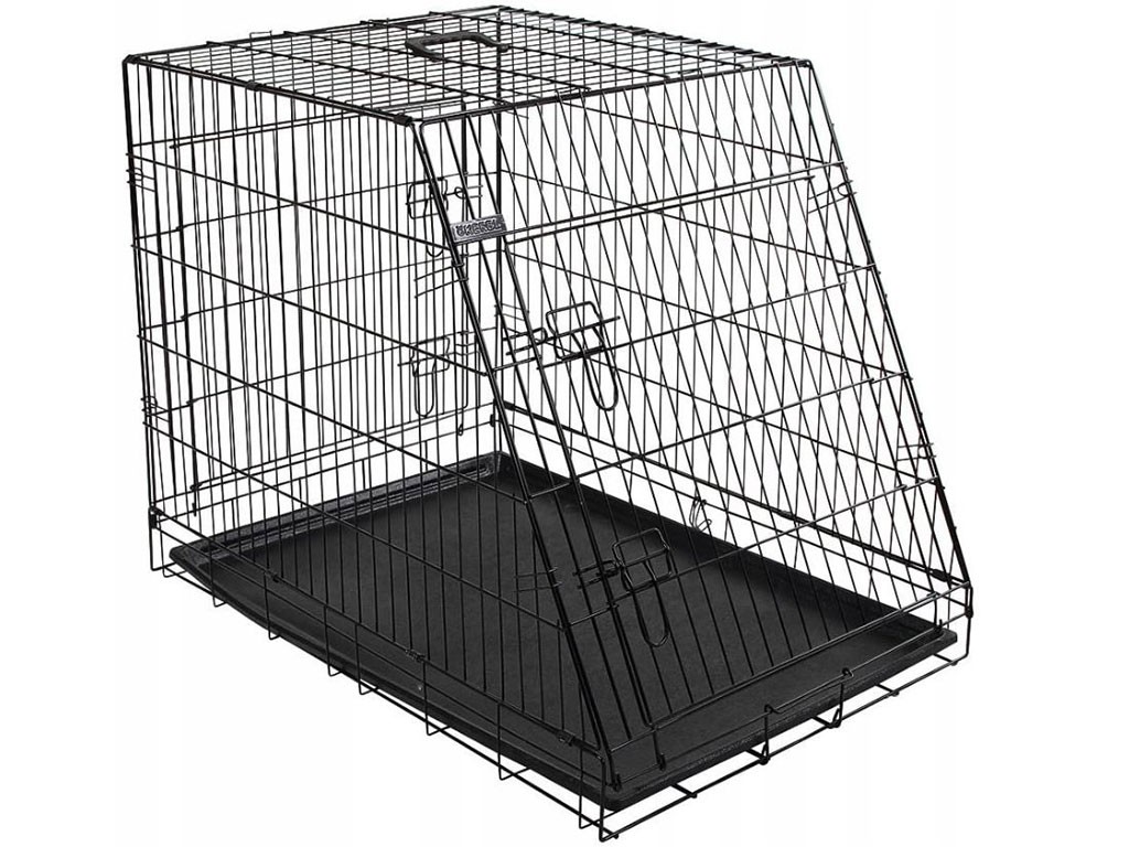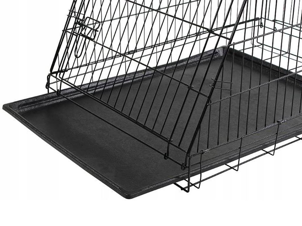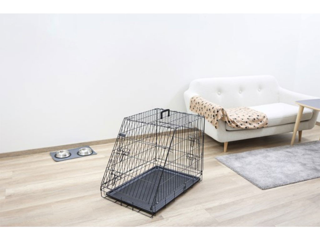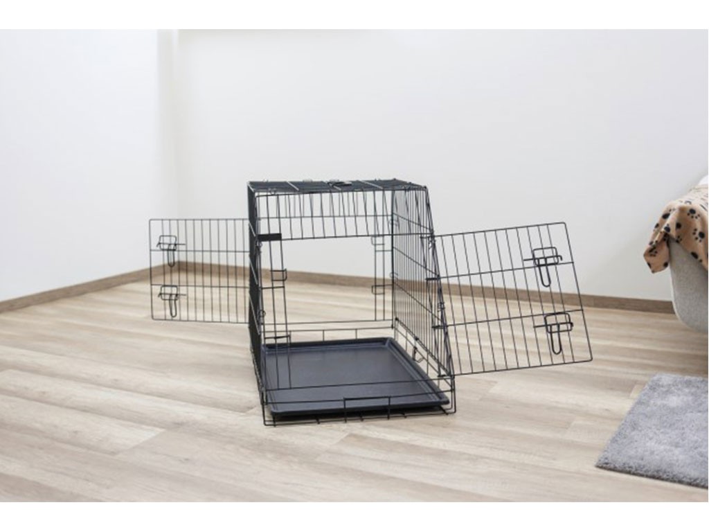 Cușcă de transport pentru câini, cu tavă detașabilă din plastic, pliabilă, ușor de montat și demontat , metal vopsit în câmp electrostatic, două uși, față și spate, mâner pentru transport ușor , față teșită pentru portbagajul mașinii. Dimensiuni 75x52x61 cm.