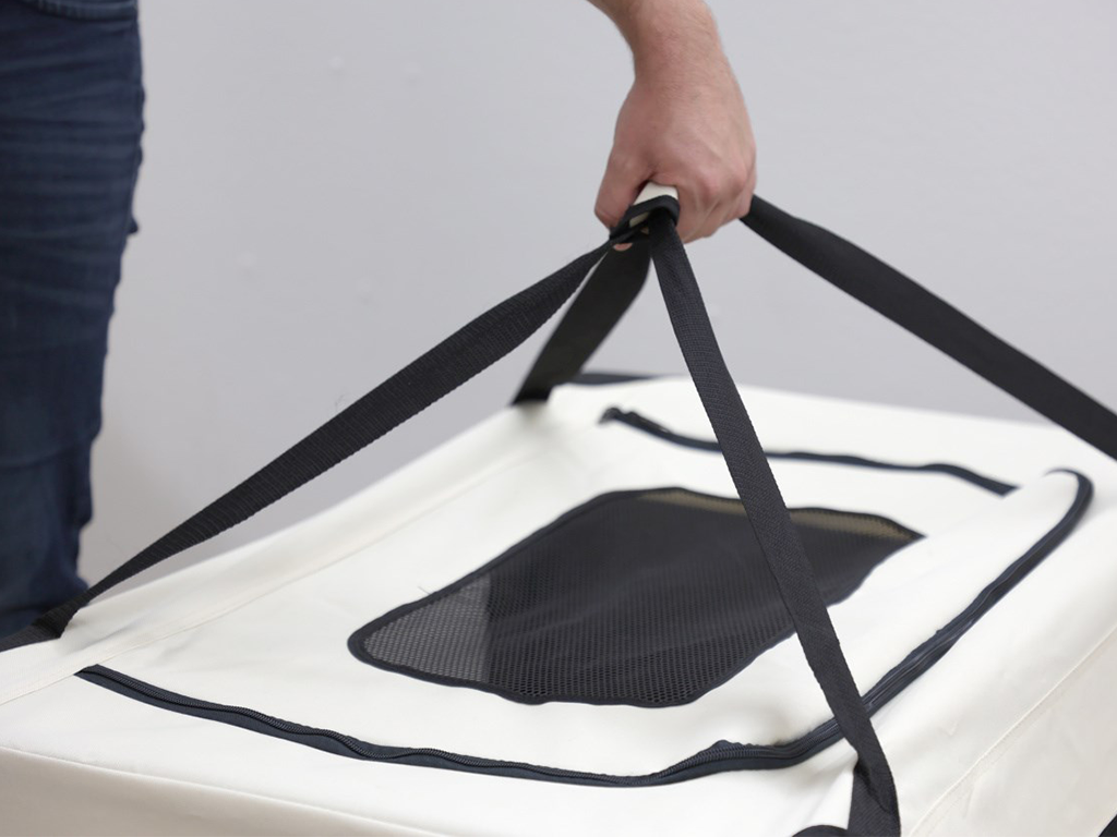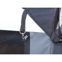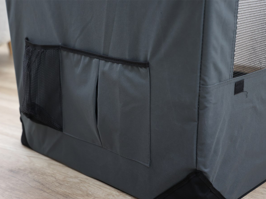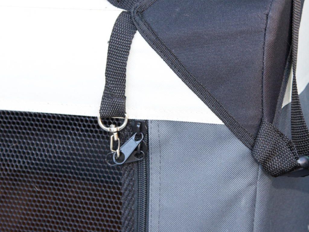 Cutie de transport pentru câini , fabricată din nailon rezistent și lavabil , construcție stabilă cu rame metalice , 3 opțiuni de deschidere cu fermoar, inserție detașabilă cu pluș moale , inserții din plasă pentru circulația aerului, buzunare laterale, suport pentru sticle, mâner și curele pentru atașarea centurilor, dimensiuni 92x65x66 cm.
