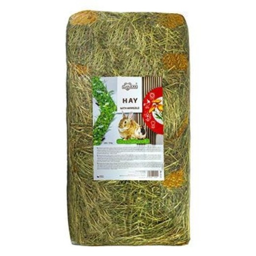 Ingrediente: fân de pajiște 99% (poate conține crețușcă de pajiște, ovăz crescut, caprifoi lânos, păiuș roșu, crețușcă de pajiște, păiuș de pajiște, corn, trifoi târâtor, trifoi de pajiște, sanguinoză, margaretă albă, plantagină lanceolată, specii de clopoțel și altele), îmbogățit cu 1% petale de gălbenele.