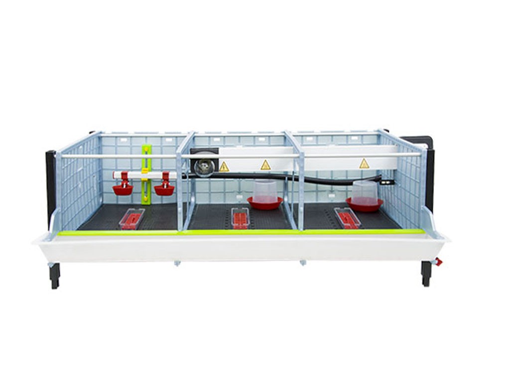 Clădiță de creștere a păsărilor potrivită pentru creșterea a 200 până la 225 de pui , cu tehnologie patentată Comfortplast , dimensiuni 104 x 60 x 196 cm . Este o cușcă cu 5 etaje și 3 compartimente , care sunt echipate cu o bandă de încălzire cu termostat reglabil și o priză pentru bec , hrănitoare cu grilă pentru a preveni risipa de furaje, adăpătoare cu alimentare cu apă dintr-un rezervor de 20 de litri .
