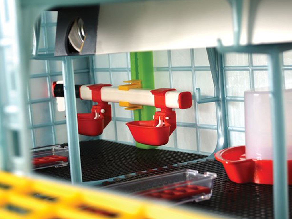 Casa de reproducere este dotată cu două adăpătoare tip pălărie pe fiecare etaj pentru primele zile de viață ale puilor și două adăpătoare tip tetină reglabile pe înălțime , care oferă o modalitate fără probleme și igienică de a uda puii în interiorul cuștii. Adăpătoarele tip tetină includ , de asemenea, boluri suplimentare cu apă , care creează adăpători automate de înaltă calitate și împiedică, de asemenea, puii să le ude. Apa este furnizată adăpătorilor automate dintr-un rezervor de apă transparent , folosind un sistem de furtunuri. Prin urmare, rezervorul oferă o imagine de ansamblu perfectă asupra nivelului actual al apei , capacul său protejează apa de contaminare și asigură, de asemenea , reumplerea ușoară pentru crescători, după cum este necesar.