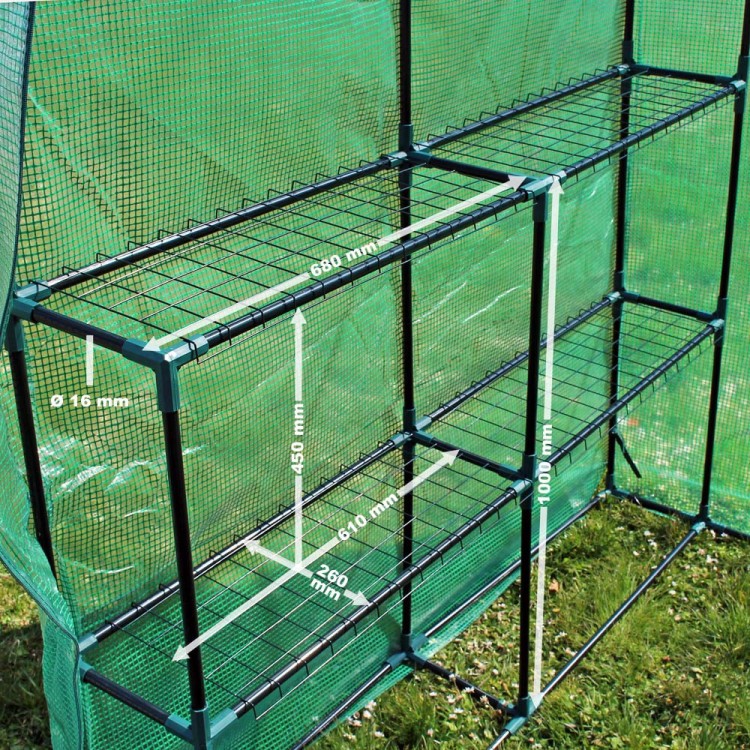 Această seră oferă mult spațiu pentru mai multe plante datorită dimensiunilor sale generoase de 143 x 143 x 195 cm . Partea frontală poate fi deschisă și închisă cu fermoar, permițând accesul în seră fără ca plantele să sufere prea mult din cauza condițiilor meteorologice nefavorabile. În interiorul serei există 8 rafturi. Rafturile metalice oferă mult spațiu pentru amplasarea corectă a ghivecelor de flori și a uneltelor de grădină.