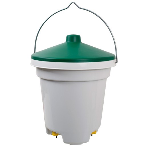 O găleată de adăpat potrivită pentru găini, rațe și alte păsări de curte. Există 3 tetine de adăpat în partea de jos a găleții care eliberează apa atunci când sunt apăsate cu ciocul. Igienic și practic! Potrivit pentru agățare - include un kit de agățare. Tetinele includ filtre care împiedică înfundarea tetinelor cu murdărie.