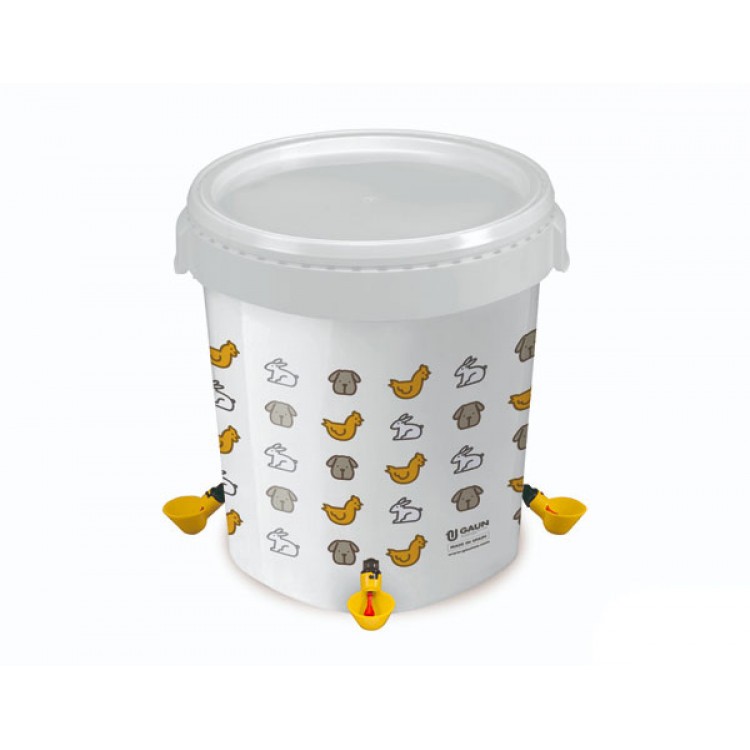 O găleată de adăpat potrivită pentru găini, rațe și alte păsări de curte. Există boluri de adăpat în jurul perimetrului găleții care se umplu atunci când sunt apăsate cu ciocul. Igienic și practic!