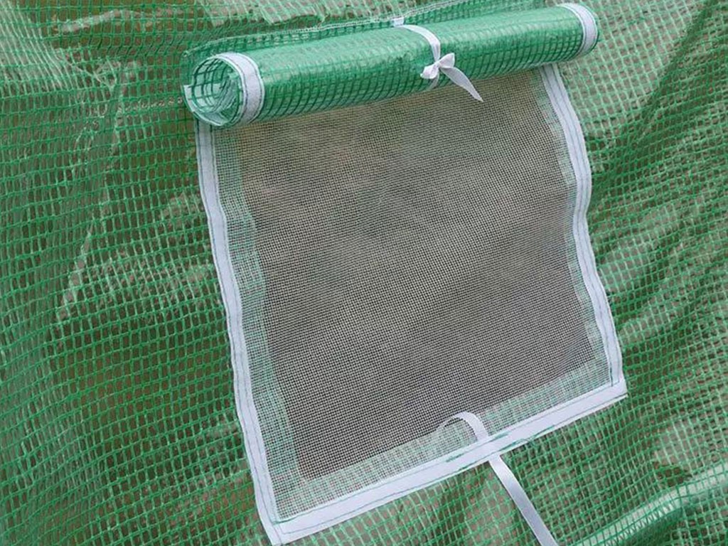 Prelata verde practică a serei este fabricată din pânză de polietilenă cu fibre de sticlă cu o permeabilitate de 140g/m2. Structura serei este alcătuită din tije metalice cu diametrul de 25 mm. Asamblarea este foarte ușoară și rapidă, structurile se îmbină pur și simplu cu un clic, prelata se întinde și se atașează de aceasta, iar întreaga seră este ancorată de sol. Pentru a asigura ventilația, sera are 6 ferestre de ventilație care pot fi închise sau deschise după cum este necesar și legate cu șireturi. Ușa spațioasă a serei poate fi rulată și legată în partea de sus cu șireturi.