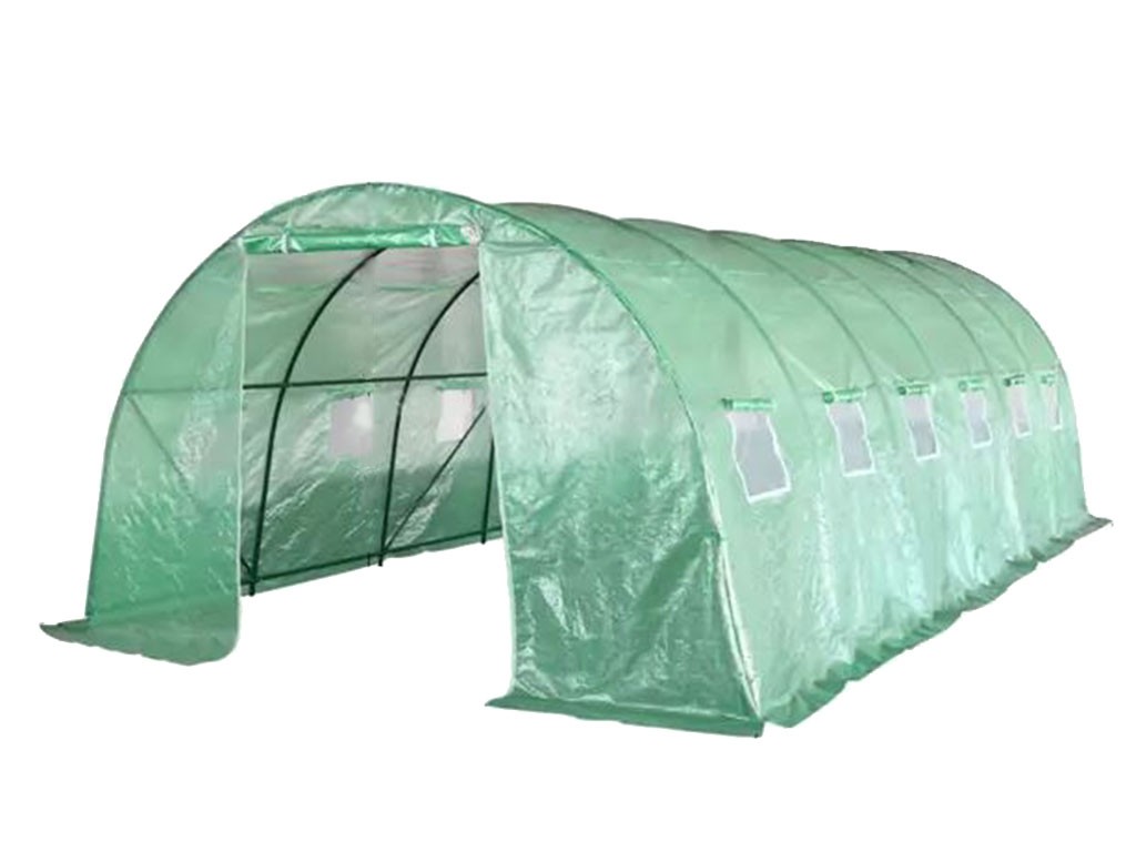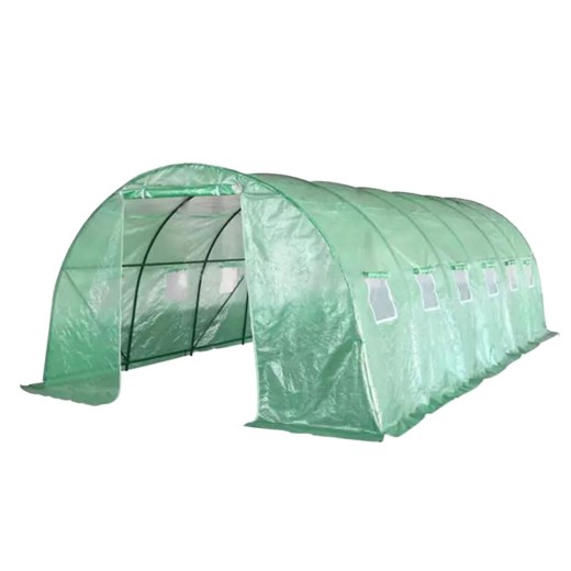 Seră din folie pentru creșterea plantelor, folie verde cu o permeabilitate de 140g/m2, fibre de sticlă/polietilenă/metal, tije de construcție cu diametrul de 25mm, 12 ferestre de ventilație pe laterale, suprafață seră din folie de 18 m2, dimensiuni 600x300x200 cm.