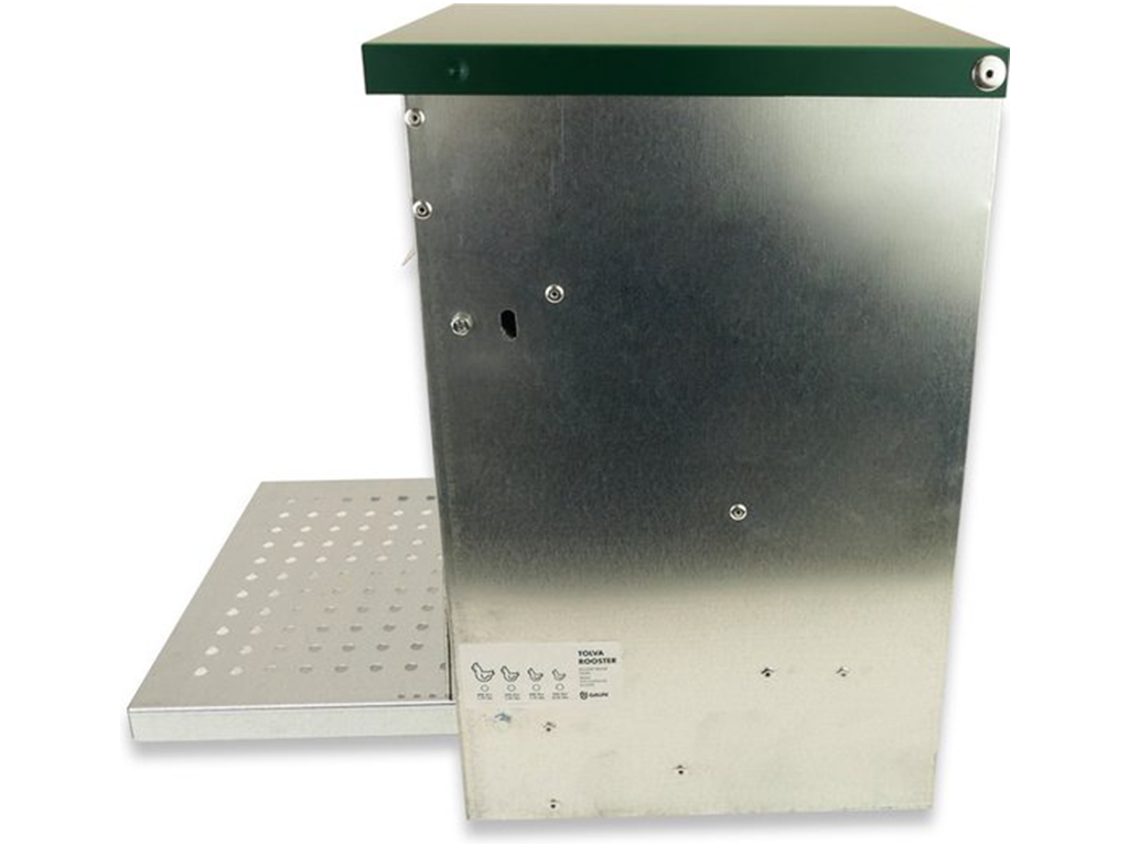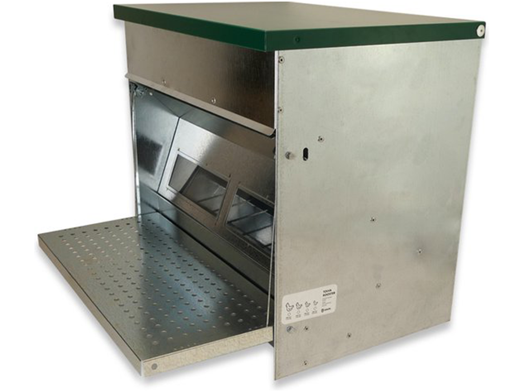 Cu capac și platformă, buncăr de 20 KG , cu fereastră, până la 50 de găini, dimensiuni: 450 x 470 x 420 mm.