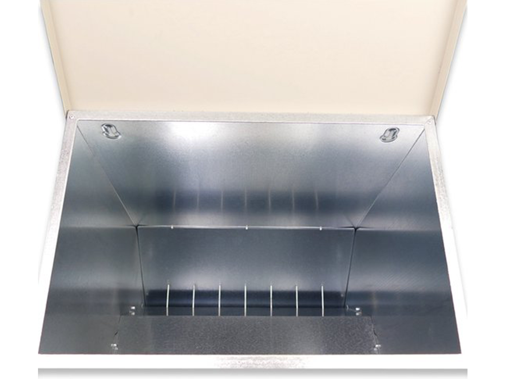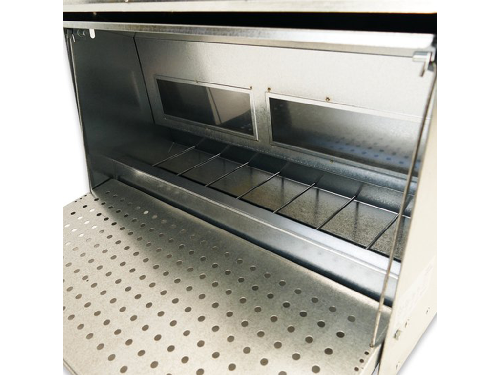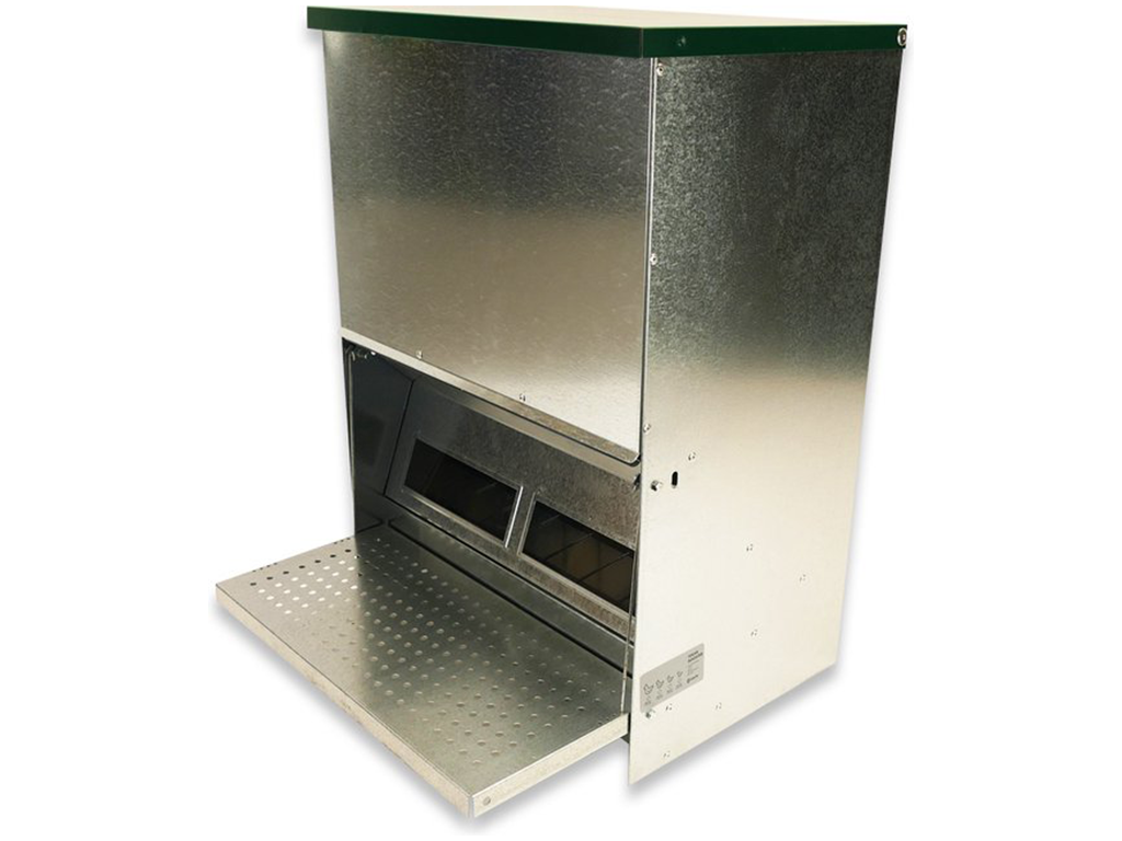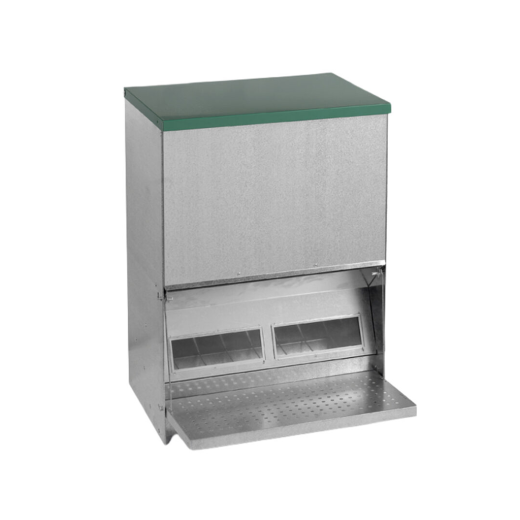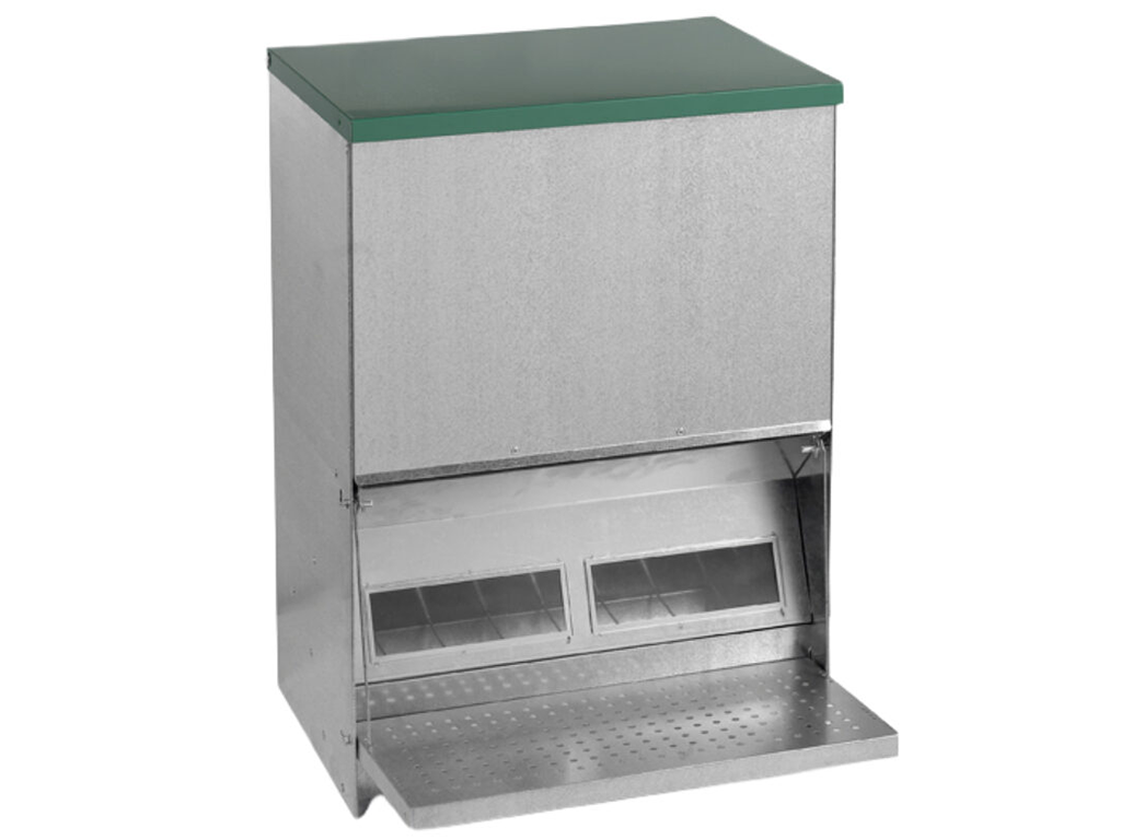 Cu capac și platformă, buncăr de 40 KG , cu fereastră, până la 100 de găini, dimensiuni: 450 x 470 x 635 mm.