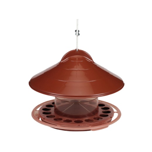 Hrănitoare pentru păsări tip buncăr , cu husă de ploaie, poate fi așezată pe sol sau agățată , cu 18 găuri, pentru reproducere de păsări mai mari , dimensiuni Ø 305 x 230 mm .
