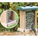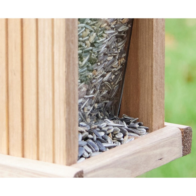 Hrănitoarea robustă poate fi umplută rapid și ușor cu multă hrană - astfel încât nu trebuie să o reumpleți încontinuu. Pur și simplu îndepărtați acoperișul casei și umpleți-o cu semințe noi pentru păsări. Datorită panourilor robuste din plexiglas, puteți vedea când trebuie reumpletă hrana. Vizitatorii mici, cum ar fi vrăbiile și mierlele, pot sta pe marginea laterală și pot ciuguli confortabil boabele.