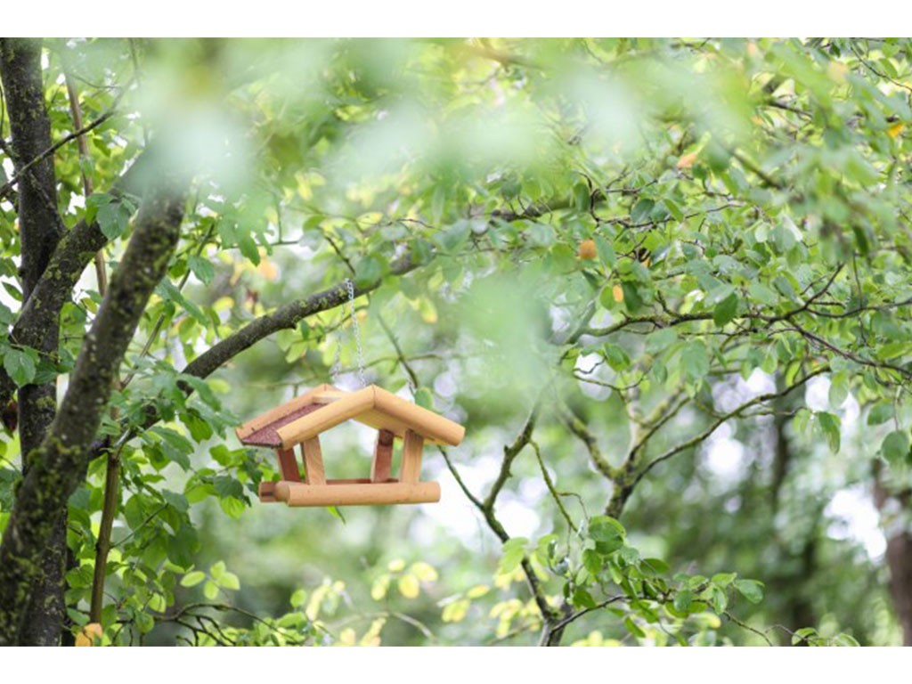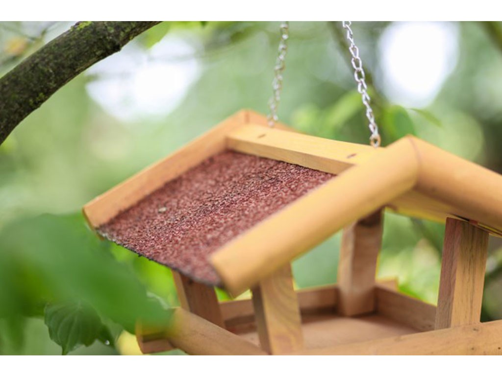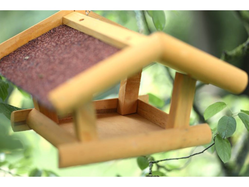 Hrănitoare pentru păsări, lemn de molid lăcuit, acoperiș bituminos , lanț metalic rezistent pentru agățare, consolă mai mare pentru acoperiș împotriva ploii, dimensiuni 29x28x18 cm.