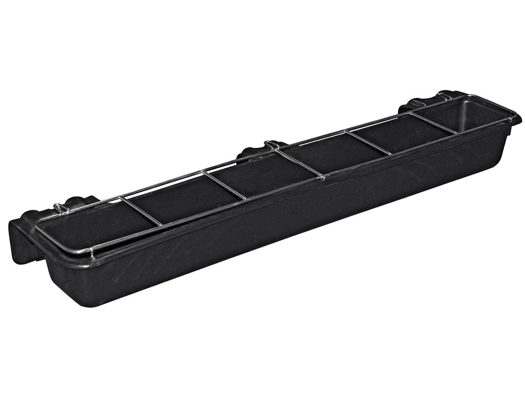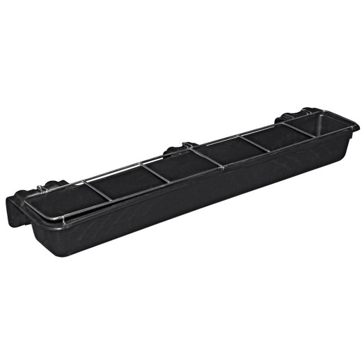 Jgheab suspendat pentru hrănire oi și capre , cu grătar pentru controlul consumului de hrană , fabricat din plastic stabil și durabil , potrivit pentru rafturi extensibile de până la 50 mm , volum 9 litri , dimensiuni 95,5x21x12 cm.