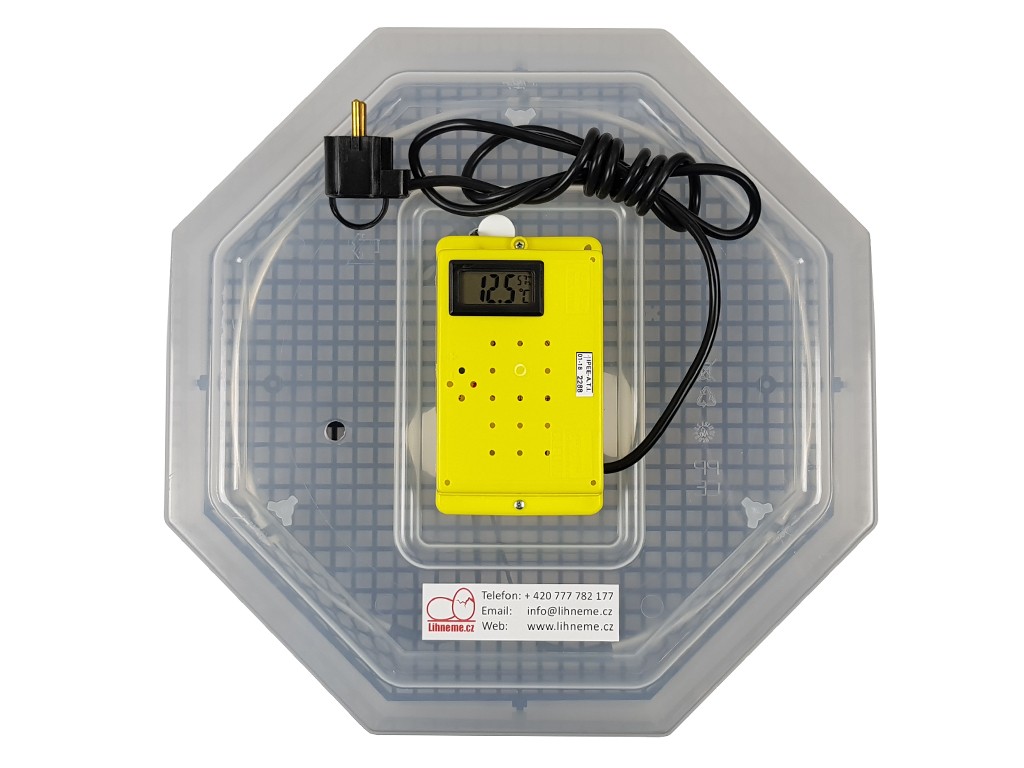 Temperatura poate fi setată și, eventual, reglată suplimentar în intervalul de la 35 la 40°C folosind regulatorul manual de pe unități electronice de control. Panoul este echipat cu un afișaj digital cu indicatori de temperatură și umiditate , iar pe partea stângă un regulator rotativ pentru setarea temperaturii necesare în incubator.