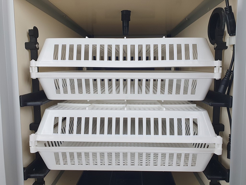 Incubatorul oferă opțiunea de întoarcere automată a ouălor folosind două grătare rotative independente Cimuka CNT30A (incluse în pachet, nu este necesar să utilizați ambele grătare rotative în timpul eclozării), care întorc ouăle în mod regulat la intervale de 2 ore . Grătarele rotative sunt echipate cu prese potrivite pentru dimensiunea ouălor de găină sau rață . Pentru a putea utiliza întoarcerea automată la eclozarea ouălor de alte dimensiuni , este necesar să achiziționați prese adecvate în funcție de tipul de păsări de curte, consultați prezentarea generală de mai sus. Dacă este necesar, incubatorul poate întoarce ouăle și manual (cu mâna), prin scoaterea grătarelor rotative din incubator și plasarea ouălor direct în coșul de incubație (2 bucăți incluse în pachet) . De obicei, aceste coșuri sunt utilizate doar în ultimele 2-3 zile de incubație , când ouăle sunt scoase din grătarele rotative și plasate în aceste coșuri, unde nu mai sunt rotite, astfel încât embrionul să poată găsi cea mai potrivită cale de ieșire din coajă și să eclozeze cu succes într-un pui.