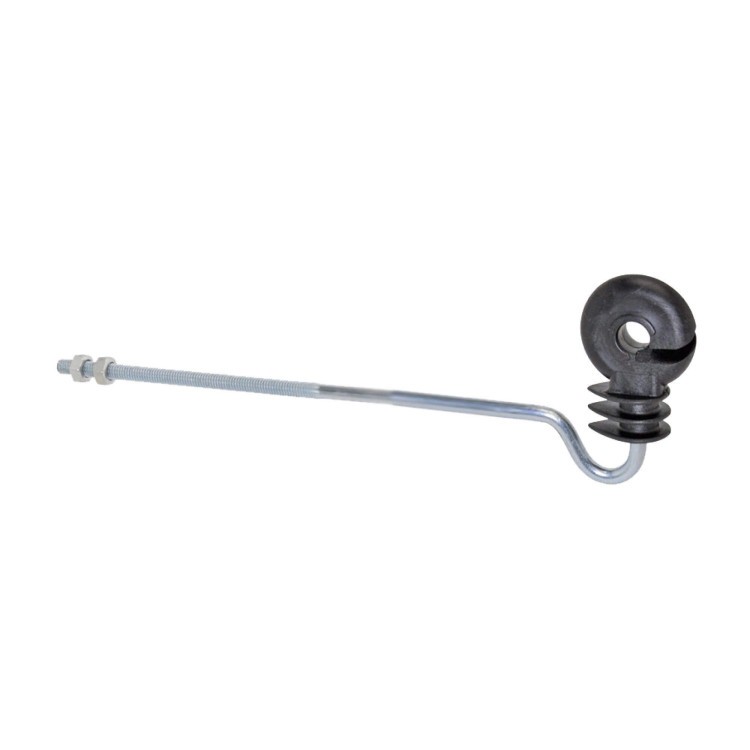 Izolator de distanță pentru gard electric premontat. Izolator circular lung cu suport curbat de 22 cm și filet metric lung M6 (10 cm) pentru montare pe un stâlp metalic sau tubular.
