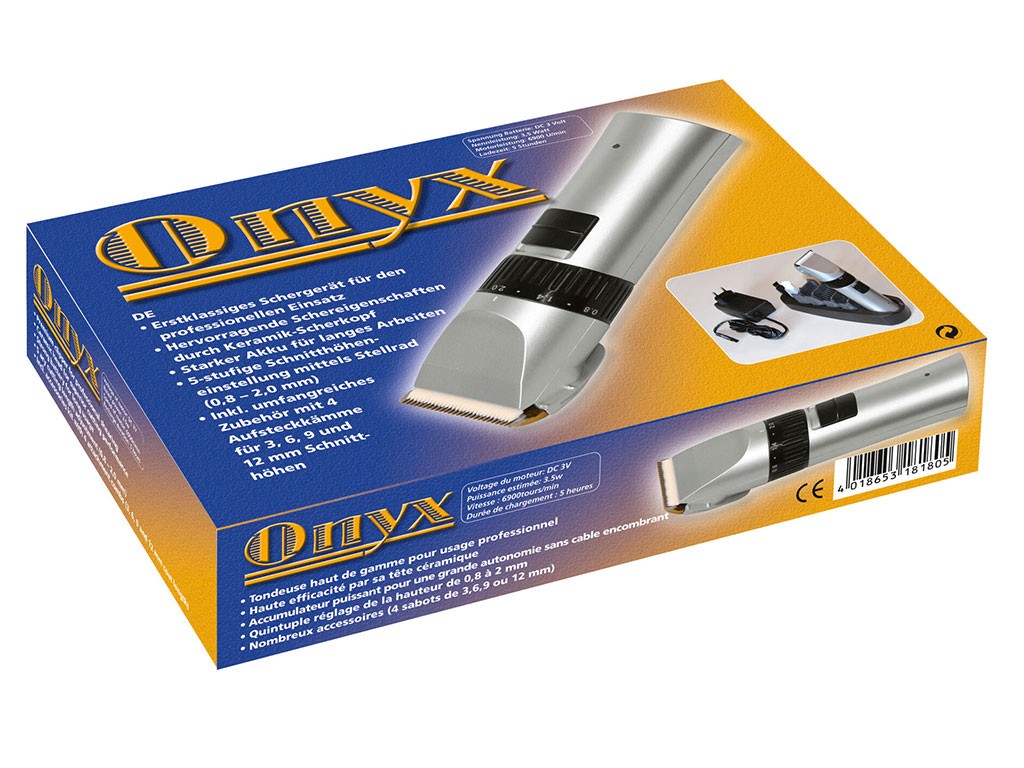 Mașină de tuns fără fir , pentru câini și cai , pentru tuns detaliat și final, proprietăți excelente de tăiere, baterie puternică reîncărcabilă Ni-Mh 1200 mAh, până la 90 de minute cu o singură încărcare, cu 4 accesorii (3, 6, 9, 12 mm), reglare integrată a capului în 5 trepte, cap de tăiere ceramic , lățime de tăiere 38 mm.