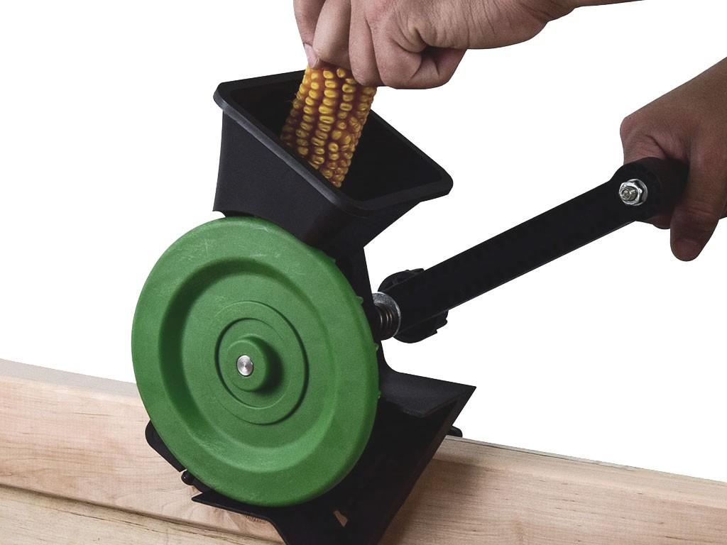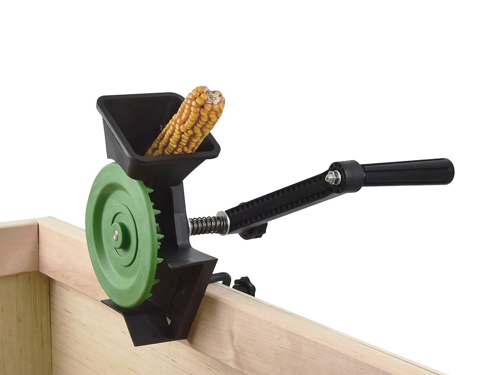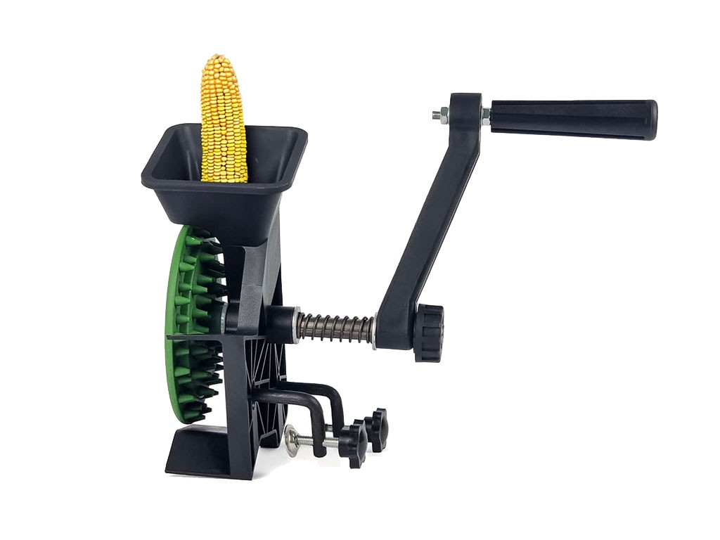 Mașină manuală de decojit porumb , reglabilă în funcție de dimensiunea știuletelui, manivelă cu mâner, disc rezistent cu țepi, cleme pentru fixarea mașinii de decojit porumb, material: plastic și oțel.