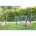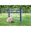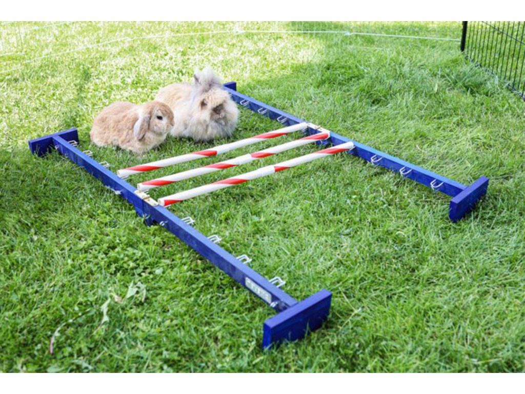 Obstacol pentru iepuri , cobai și alte rozătoare, pentru dresaj de agilitate sau sărituri între iepuri , înălțime de săritură reglabilă 7 - 49 cm, lungime de săritură reglabilă 7 - 92 cm, lățime de săritură 62 cm, doi stâlpi de lemn, 10 bețe de plastic, diverse variante de săritură posibile.