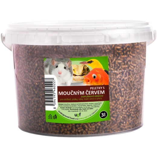 Peletele pentru viermi de făină sunt special concepute ca hrană universală pentru păsări, pești, rozătoare și reptile, cu accent pe un conținut mai ridicat de proteine (21,5%) și un conținut mai scăzut de grăsimi (3,2%).