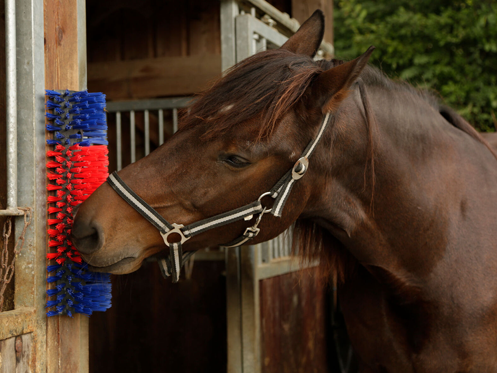 Perie de frecat , pentru cai și bovine, pentru pereți, colțuri și stâlpi , special pentru perierea capului și gâtului, peri din poliamidă de 5 cm, dimensiuni 22x50x9 cm.