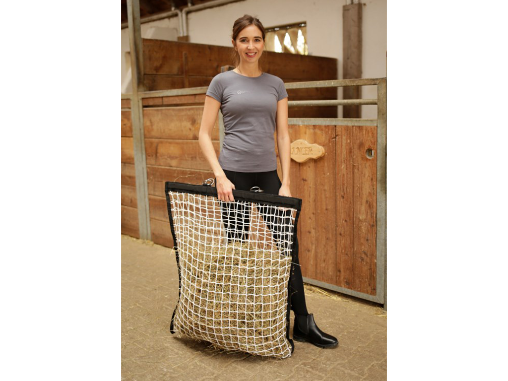 Plasă de fân , dimensiunea ochiurilor 3x3 cm , fabricată din material extra rezistent, velcro pentru a preveni deschiderea accidentală, cârlig practic pentru agățare, capacitate 5,5 kg, dimensiuni 83x83 cm .