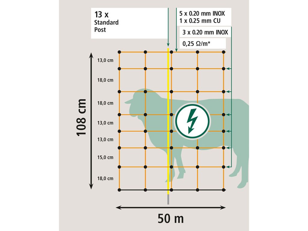 Plasă electrică pentru gard de oi , 8 fire orizontale, fir superior ranforsat , tije robuste din plastic cu 1 vârf, noduri sudate extrem de stabile , combinație de fire de cupru și oțel inoxidabil, conductivitate crescută, înălțime 108 cm și lungime 50 m.