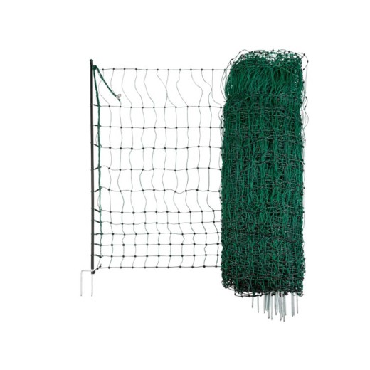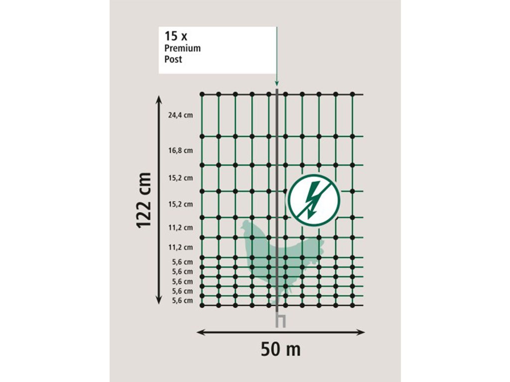 Plasă PREMIUM neconductoare pentru gard de păsări , cu o înălțime de 122 cm și o lungime de 50 m. Pachetul include 15 stâlpi extrem de rezistenți, cu țepi dubli galvanizați, care asigură o stabilitate ridicată a incintei. Datorită dimensiunii deosebit de mici a ochiurilor din partea inferioară, plasa este potrivită pentru găini sau miei.