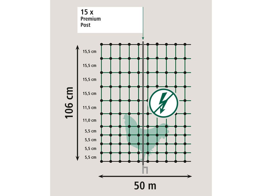 Plasă de gard pentru păsări de curte neconductoare, 15 tije din fibră de sticlă PREMIUM, 4 cârlige de ancorare, țăruș dublu galvanizat, dimensiune mai mică a ochiurilor în partea inferioară, înălțime 106 cm și lungime 50 m.