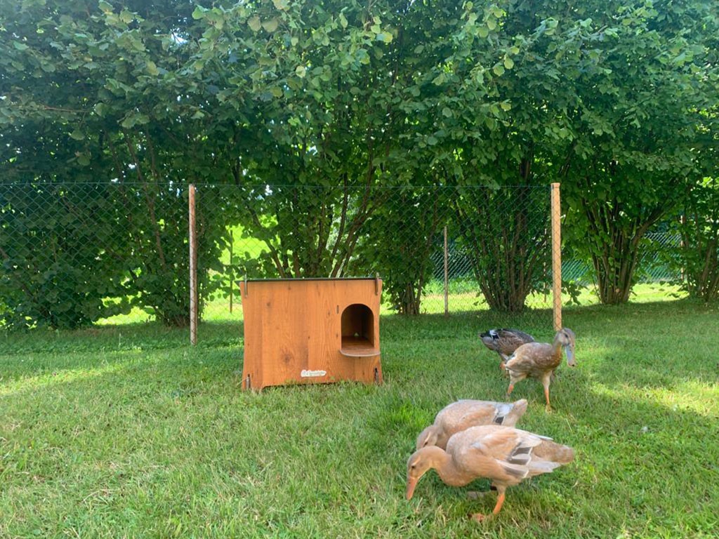 Căsuță pentru rațe cu dimensiunile de 70x56x54 cm. Aceasta este o căsuță pentru rațe foarte confortabilă, cu acoperiș deschizător pentru o curățare ușoară. Căsuța pentru rațe este fabricată din laminat HPL extrem de durabil și oferă proprietăți termice și igienice excelente.